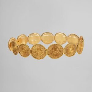 Cinto com medalhas de Capim Dourado adornado com cordão metálico dourado feito em parceria com artesãs da região do Jalapão, Tocantins. Acabamento interno em couro vegano dourado. Cada cinto é inteiramente feito à mão, do início ao fim do processo, levando muitas horas para ser confeccionado. Fecho regulável em 3 ajustes em botão de pressão de latão puro.