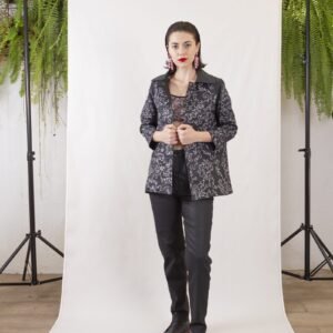 A Jaqueta Baz é feita em sarja preta encerada e desenhada à mão pelo artista Matheus Baz. Possui modelagem reta, com bolsos, forro, fechamento frontal por botões de pressão.