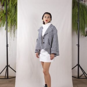 O colete Monique é feito em tecido mix de xadrez pied de coq e pied de poule. Possui modelagem ampla, comprimento curto, sem mangas, com 2 bolsos na lapela, fechamento frontal por 2 botões de pressão. Com certeza uma peça chave P&B!