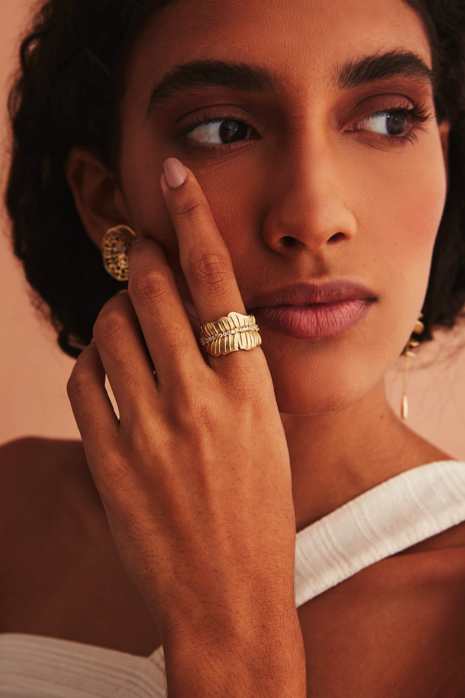 O Anel Mita é confeccionado em ouro amarelo 18K de upcycling e diamantes lab grown. A peça possui 20 diamantes de 1 ponto cravados em sua superfície.