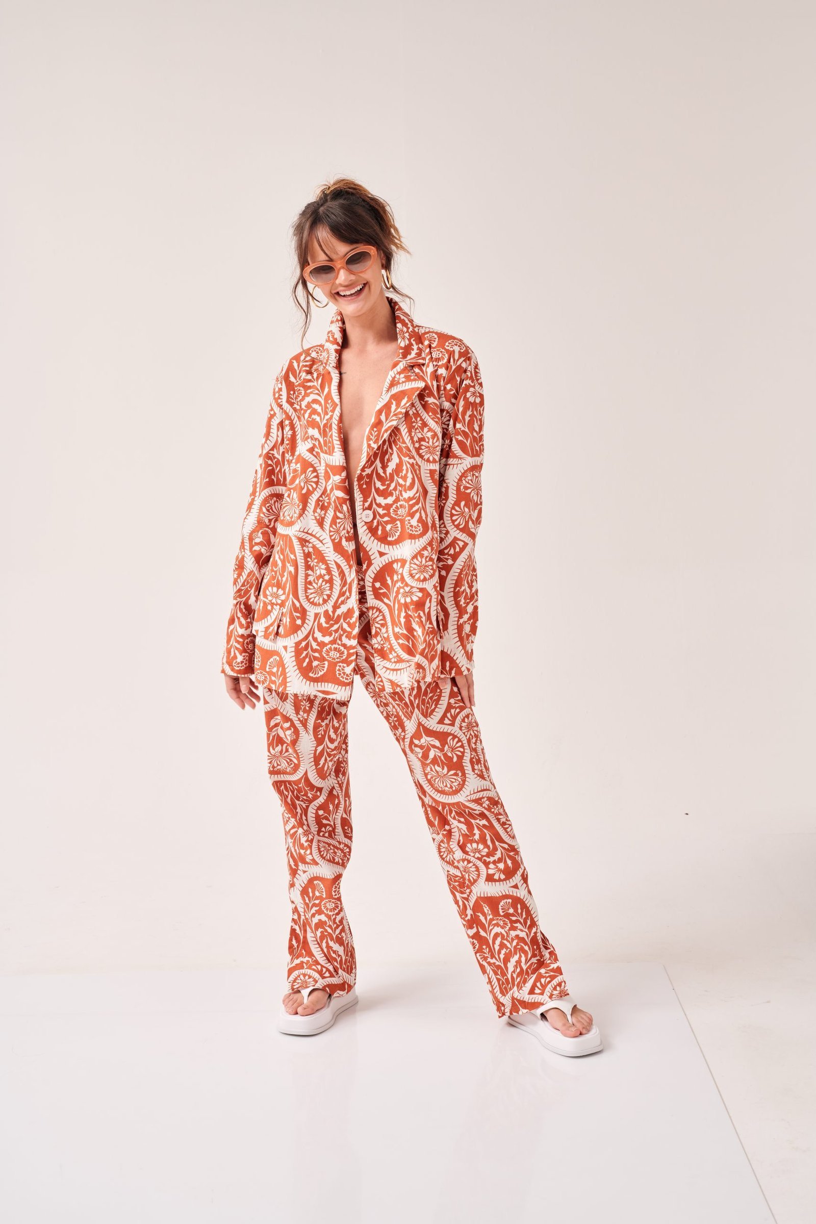 Blazer estampado com modelagem mais over, feito com tricoline 100% algodão e forro do mesmo tecido.