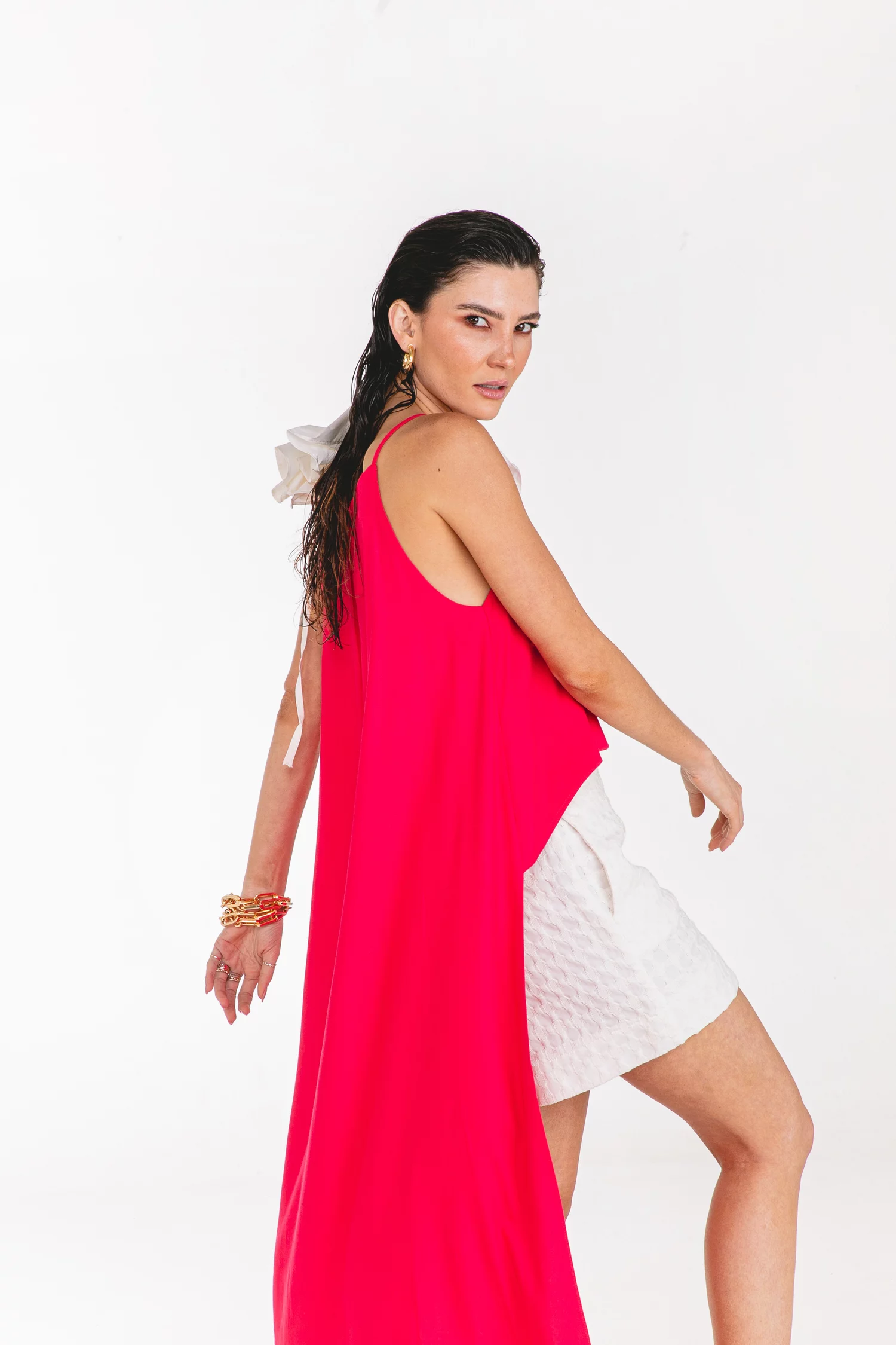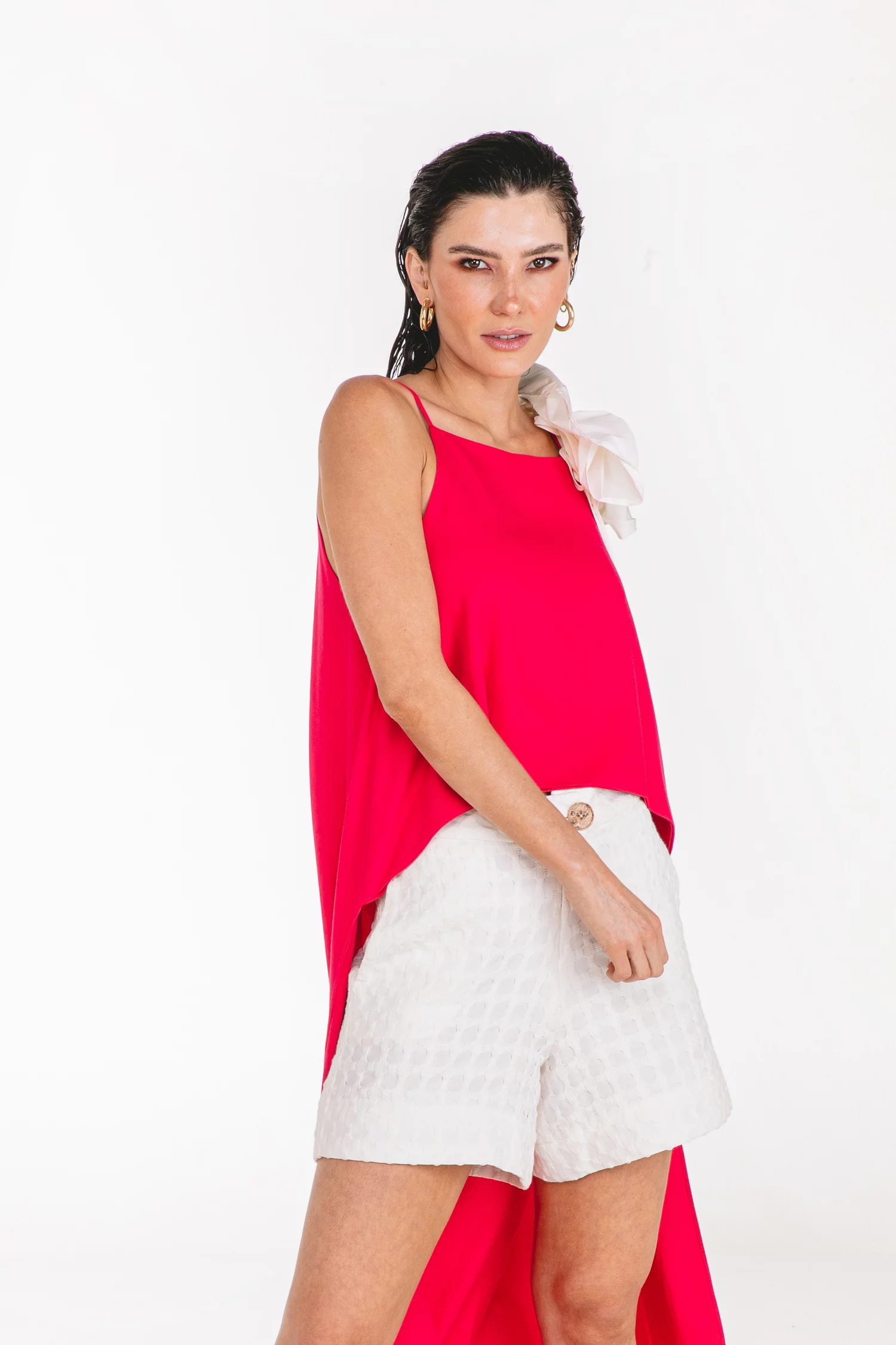 Top com modelagem irregular e alças finas. mais curto na frente, acabamento duplo no peito, e desce levemente nas costas bem alongado.