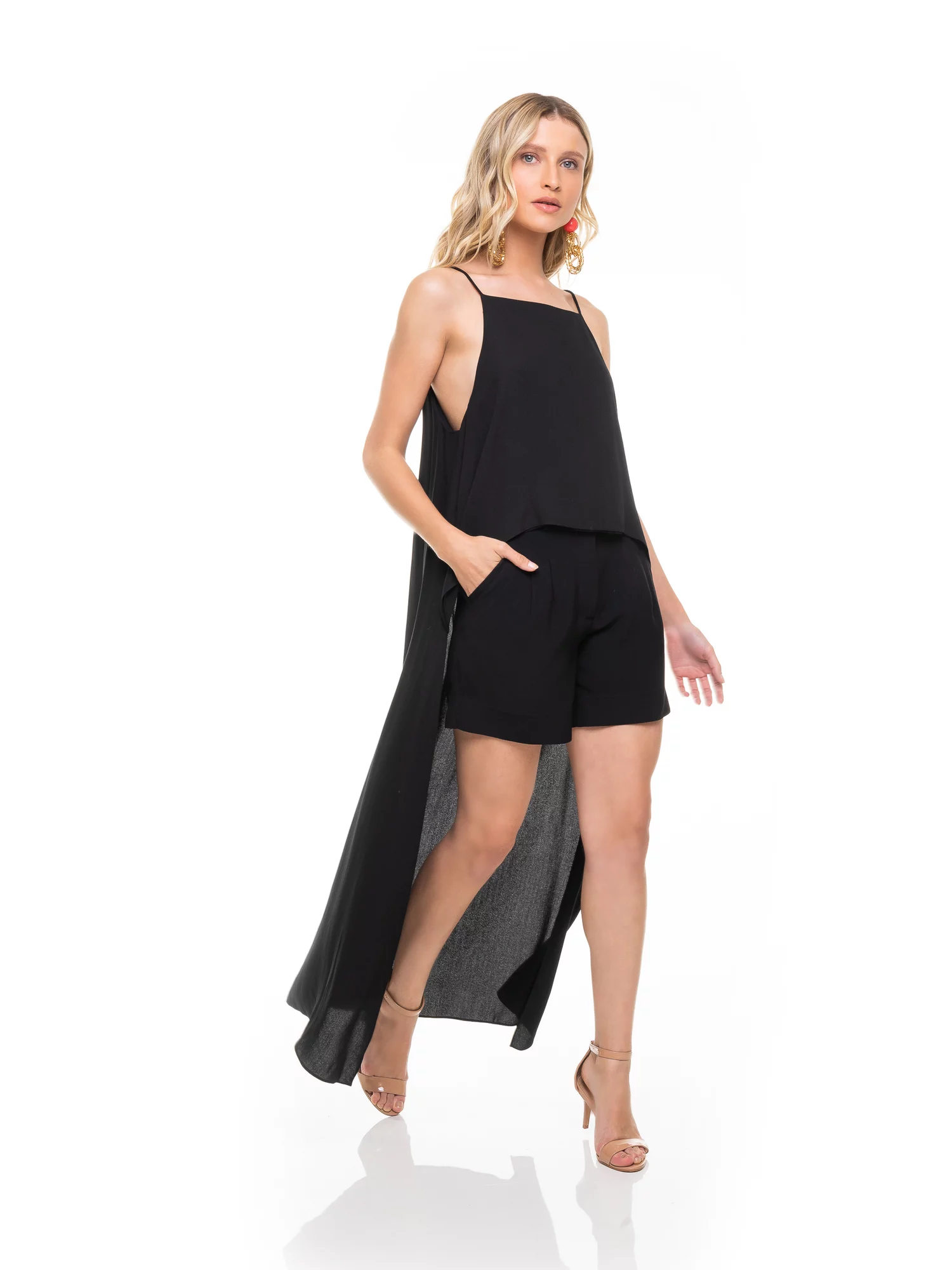 Top com modelagem irregular e alças finas. mais curto na frente, acabamento duplo no peito, e desce levemente nas costas bem alongado.