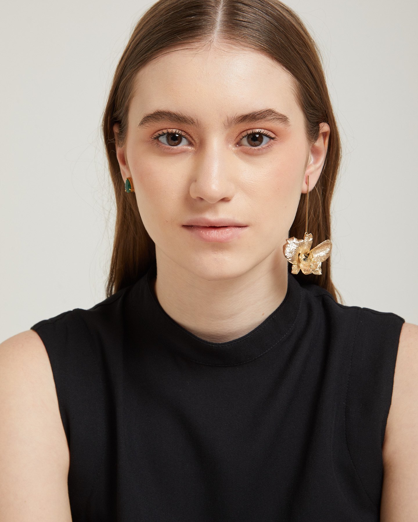 Brinco confeccionado a partir de orquídea natural banhado em ouro.