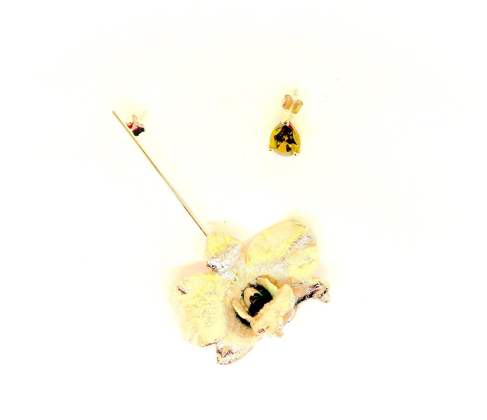 Jóia botânica manufaturada a partir de flores de orquídea, natural, metalizada em cobre e banhada em ouro.