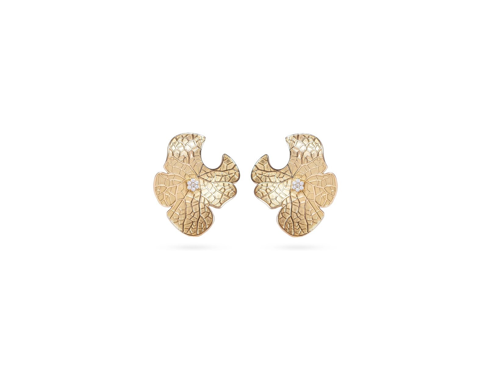 O Brinco Vitória é confeccionado em ouro amarelo 18K de upcycling e diamantes lab grown. A peça possui 7 diamantes de 1 ponto cravados em forma de flor em cada um dos brincos, totalizando 14 diamantes.