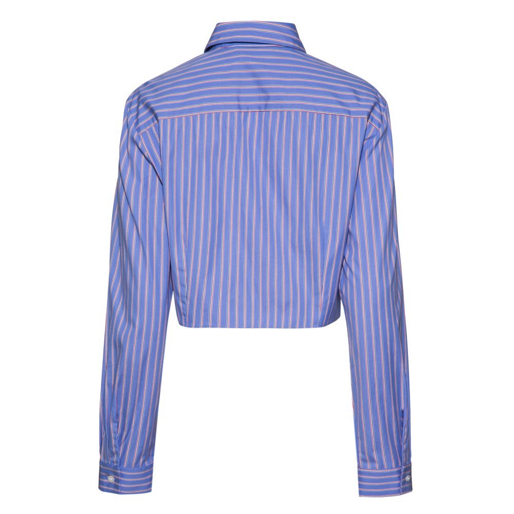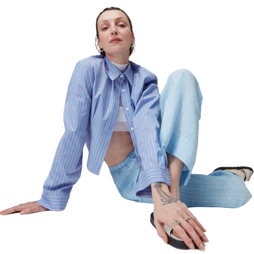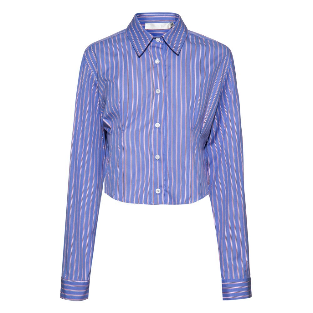 Gola clássica, fechamento frontal por botões, mangas longas e abotoamento no punho.