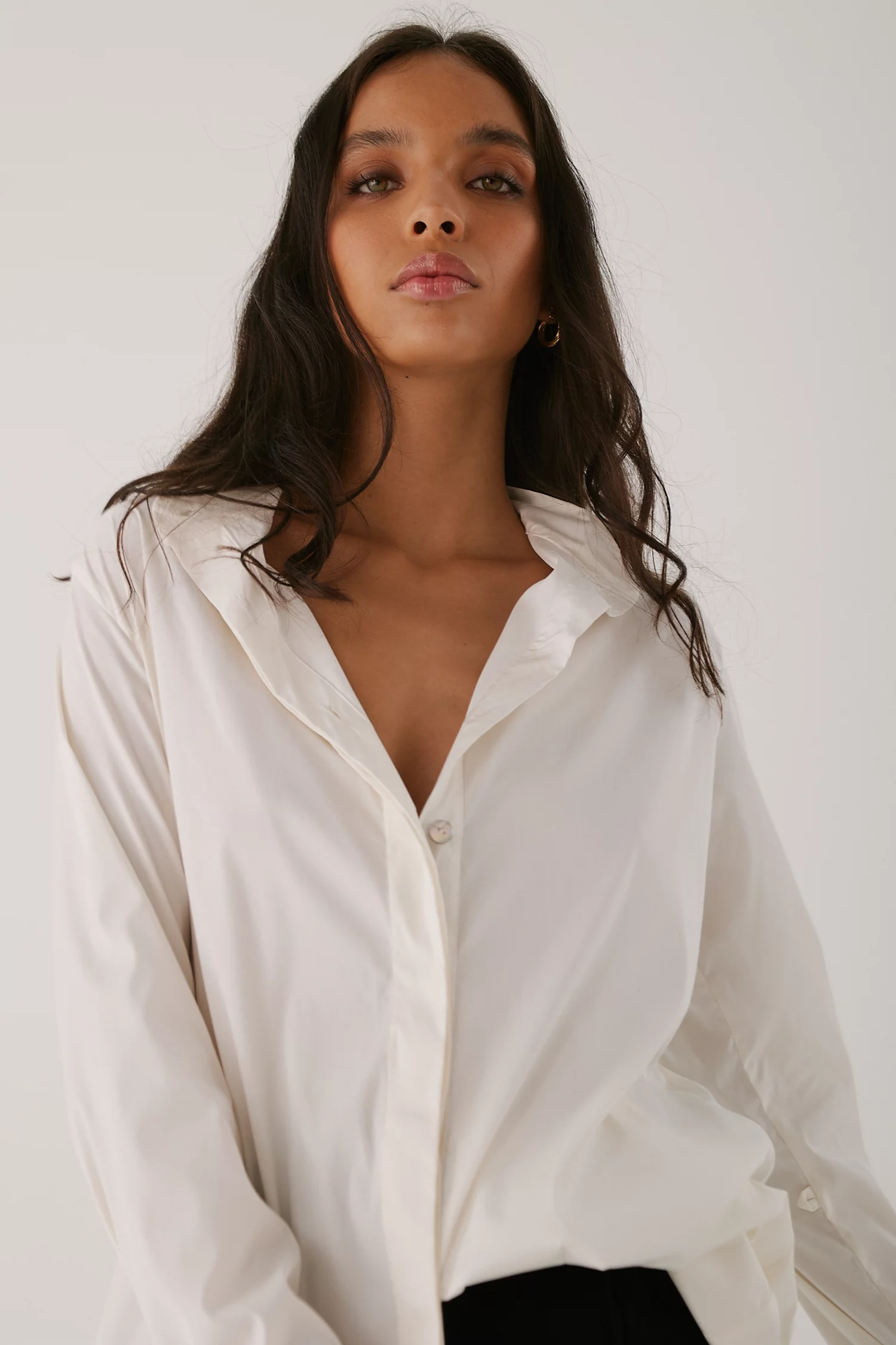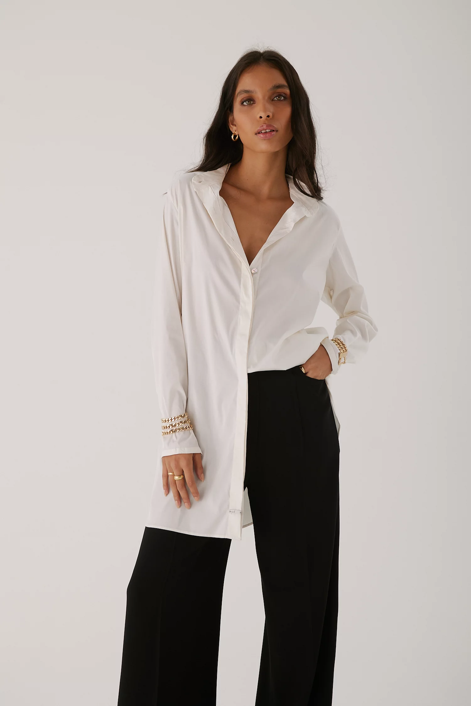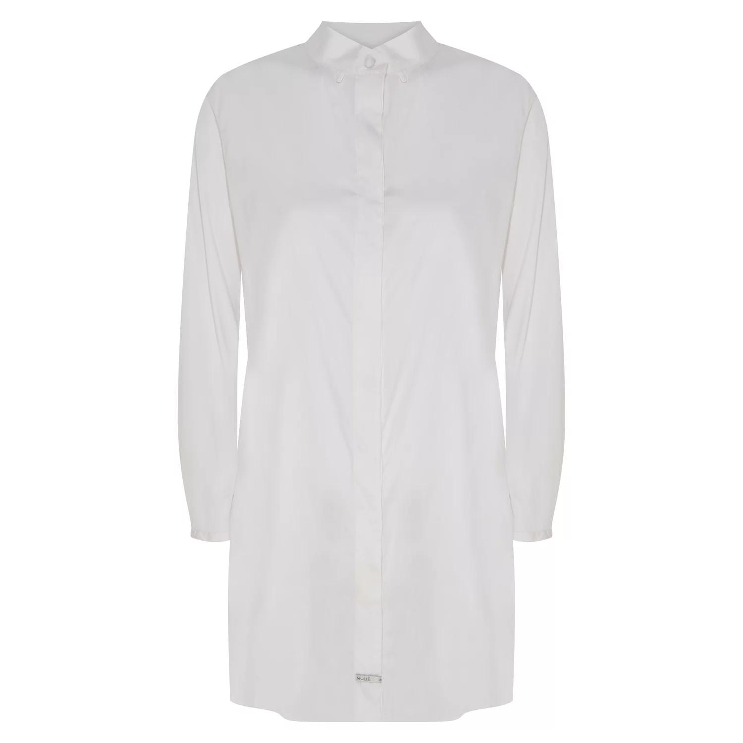 Blusa comprida com abotoamento frontal embutido, com botões de corozo ( semente 100% natural), e botões forrados na gola e mangas.
