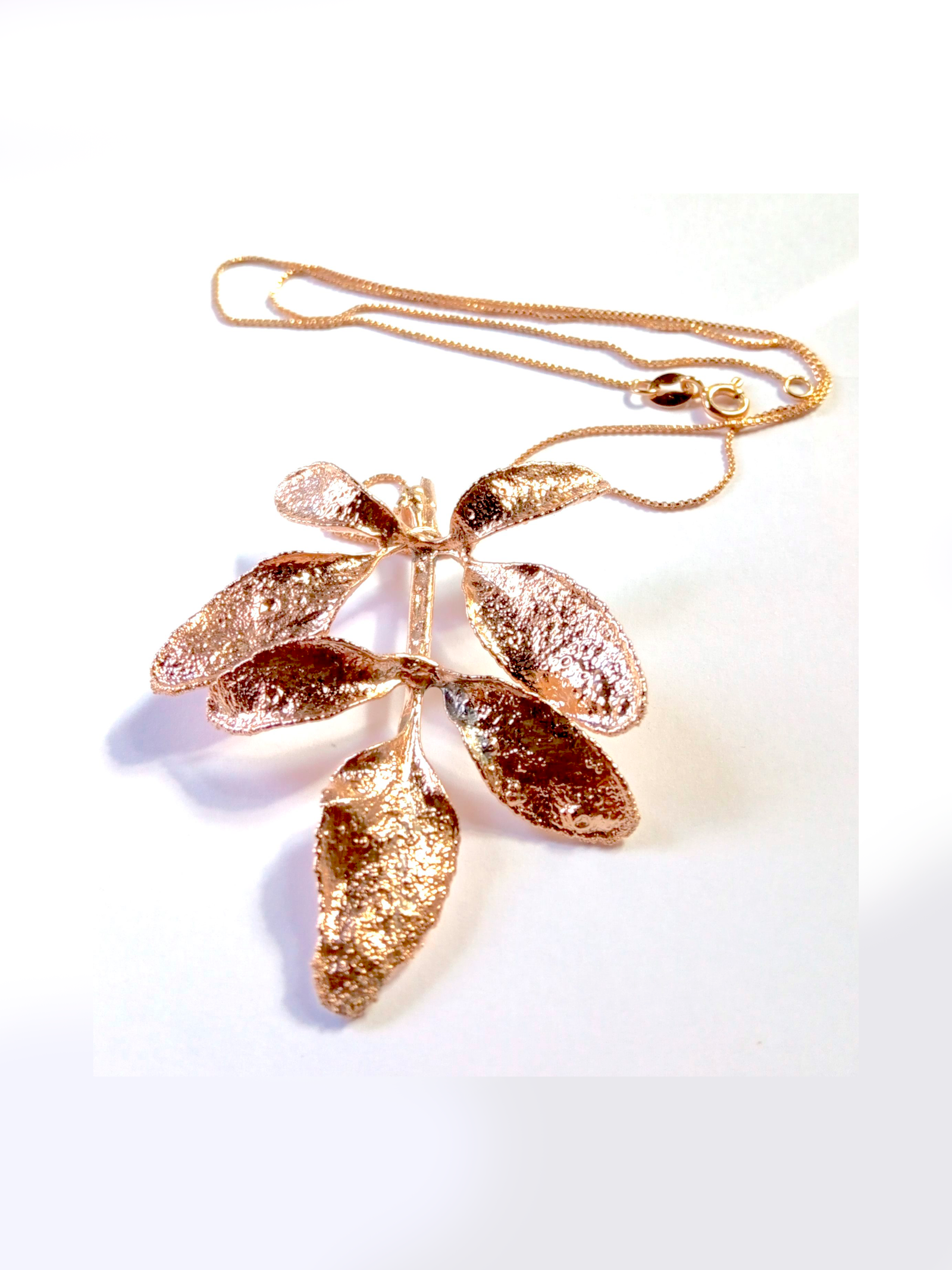 COLAR DE PRATA RECICLADA E PINGENTE DE FOLHAS DE ARRUDA METALIZDA E BANHADA EM OURO