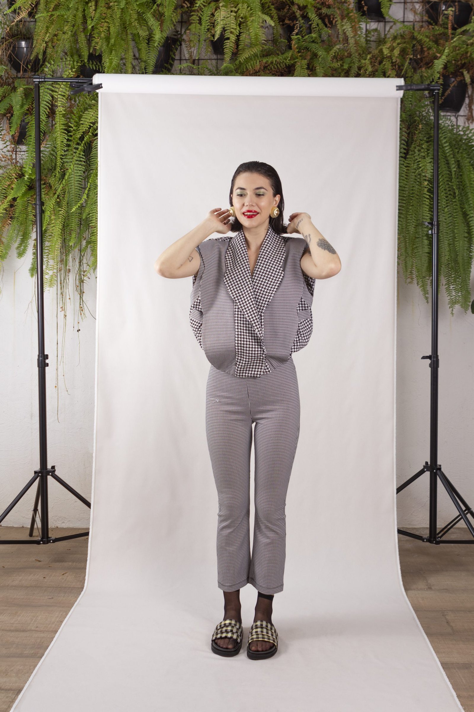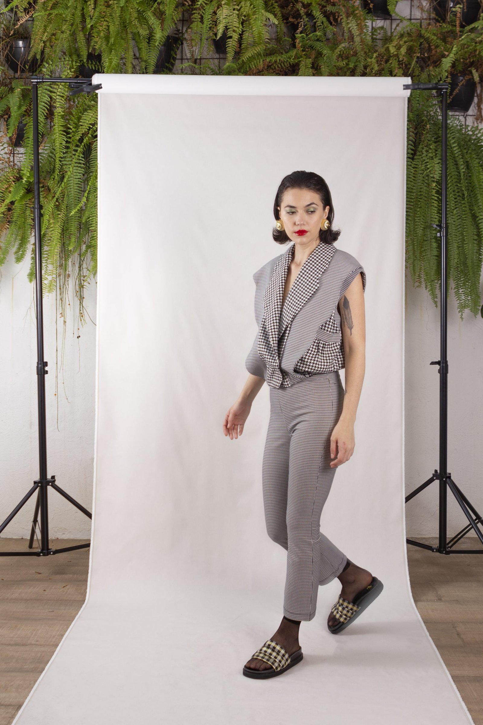 O colete Monique é feito em tecido mix de xadrez pied de coq e pied de poule. Possui modelagem ampla, comprimento curto, sem mangas, com 2 bolsos na lapela, fechamento frontal por 2 botões de pressão. Com certeza uma peça chave P&B!