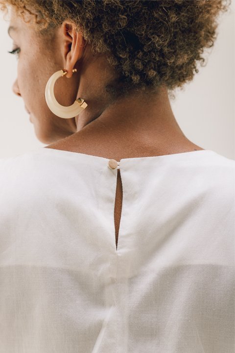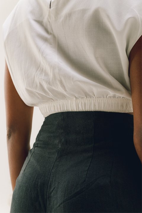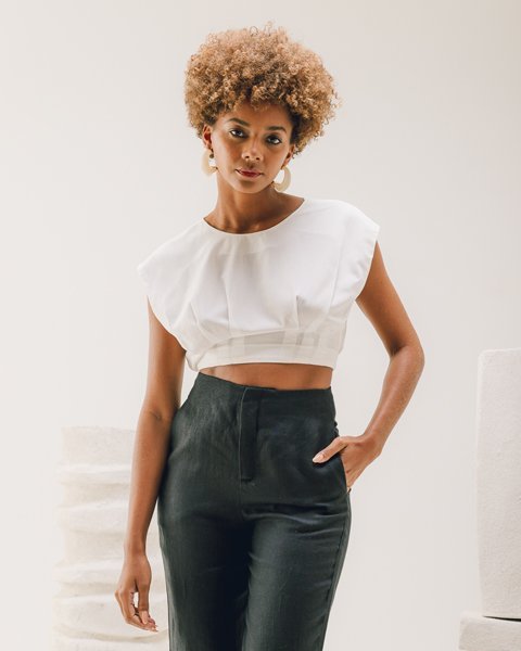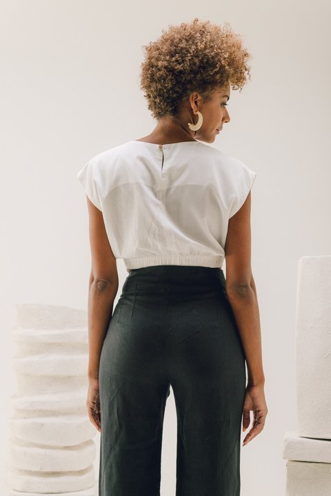 Top cropped com pregas frontais as quais conferem leveza à peça. Possui elástico na cintura da parte das costas e fechamento por gota e botão de madeira na gola.