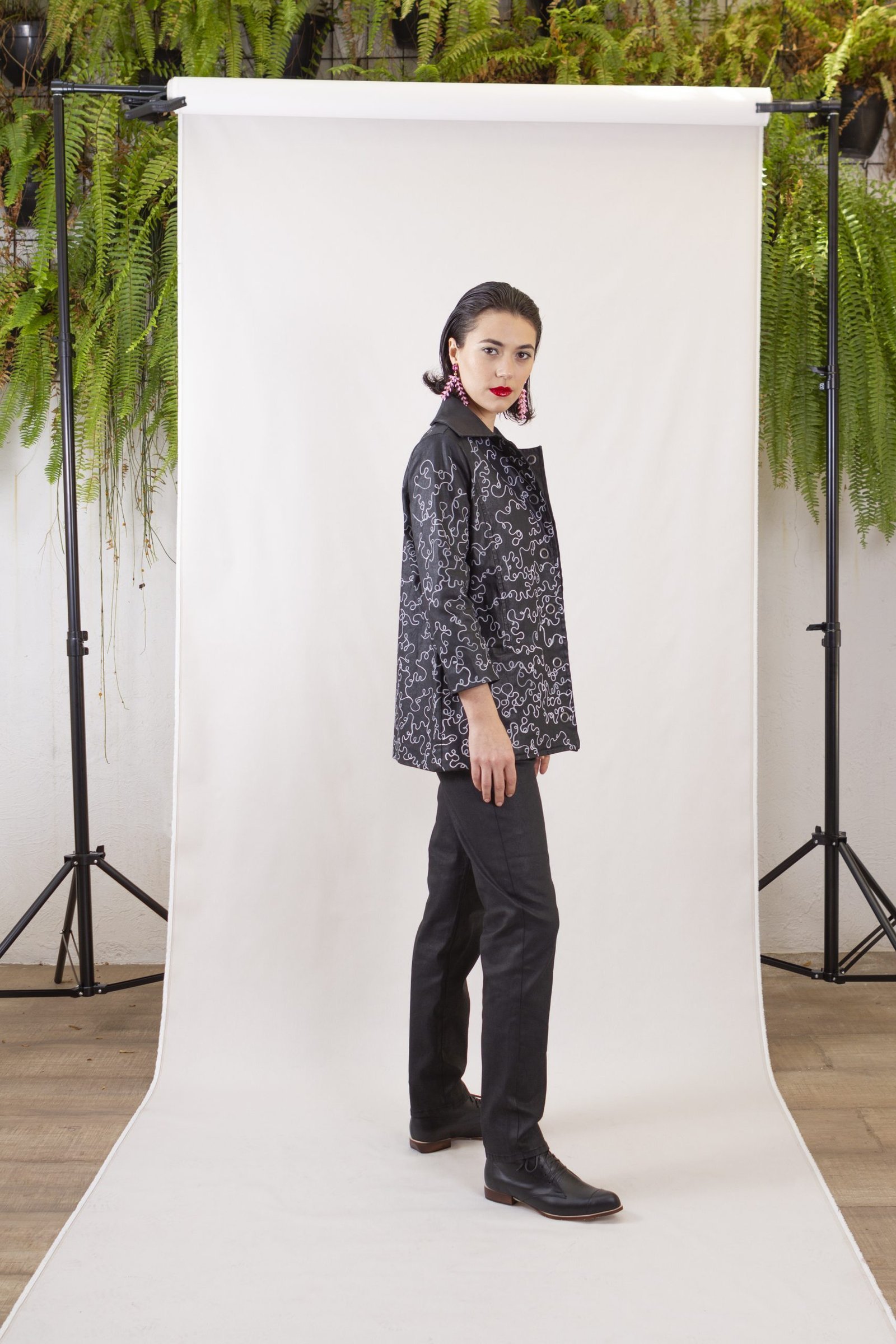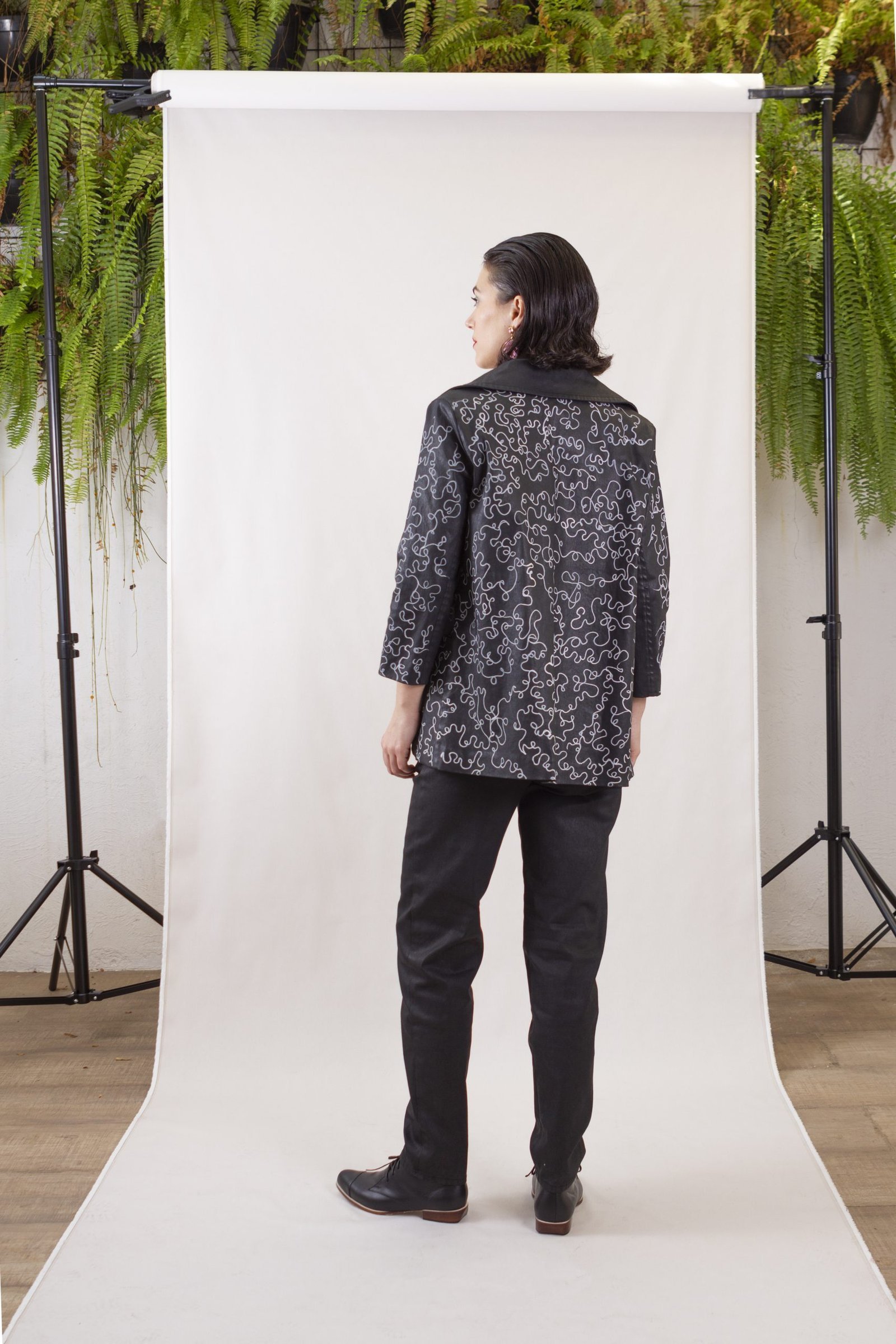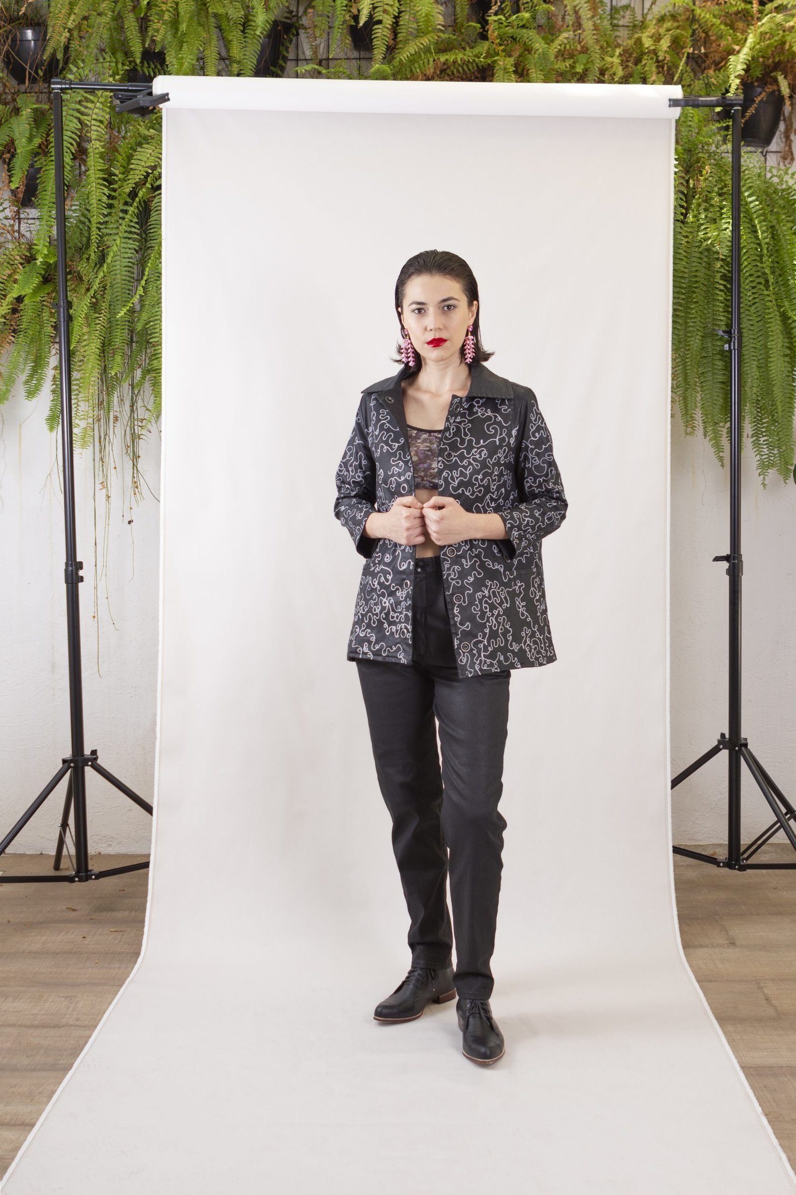 A Jaqueta Baz é feita em sarja preta encerada e desenhada à mão pelo artista Matheus Baz. Possui modelagem reta, com bolsos, forro, fechamento frontal por botões de pressão.