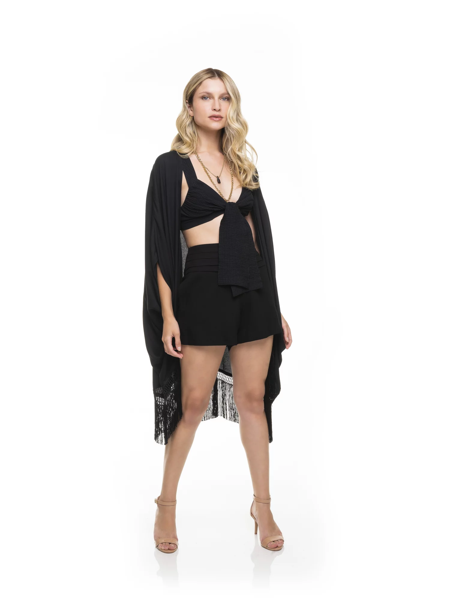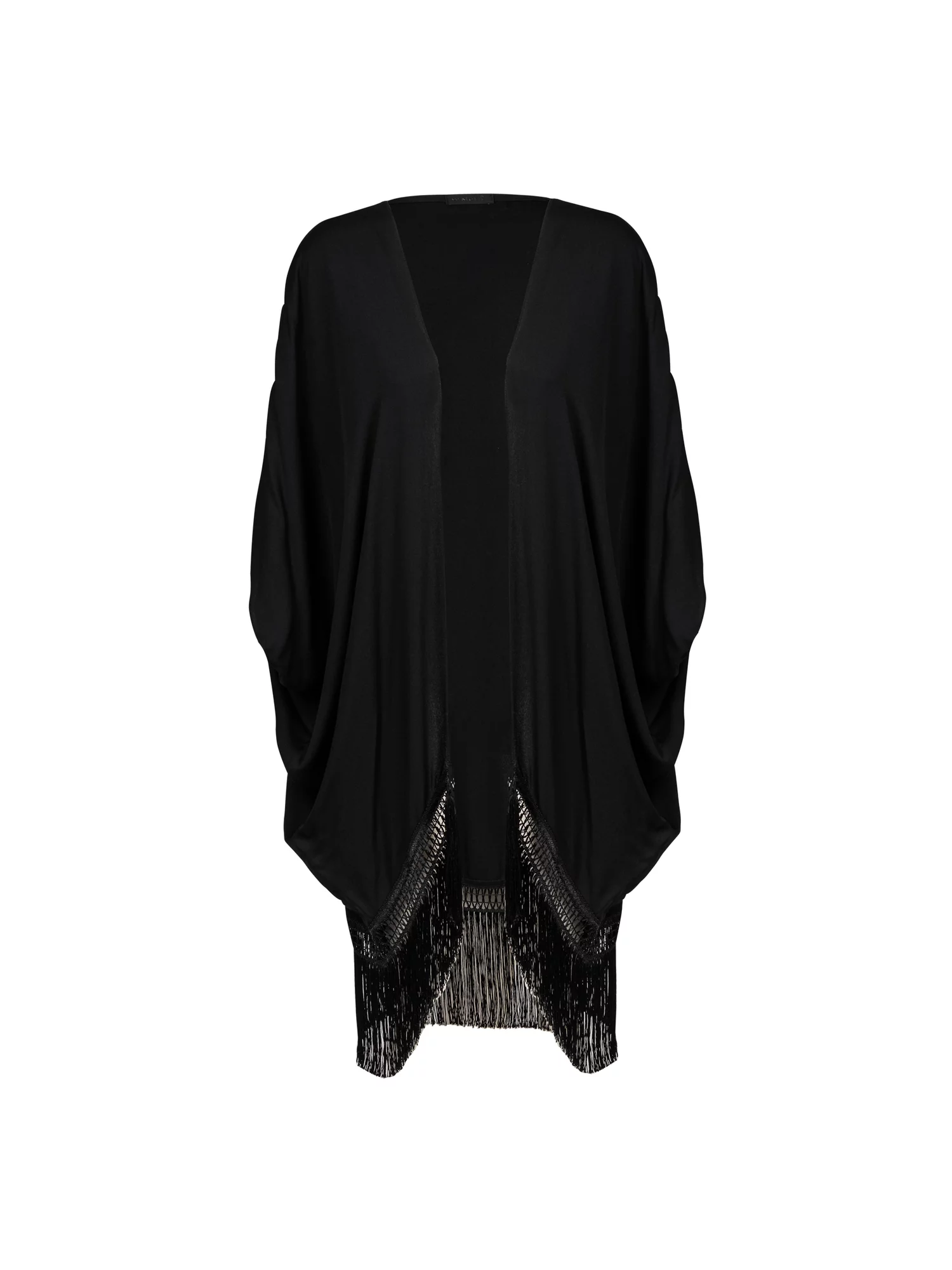 Kimono com modelagem mais ampla, cortado em viés e franjas por toda a volta.