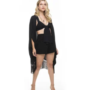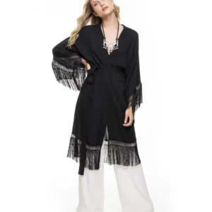 Kimono com modelagem ampla e franjas longas.