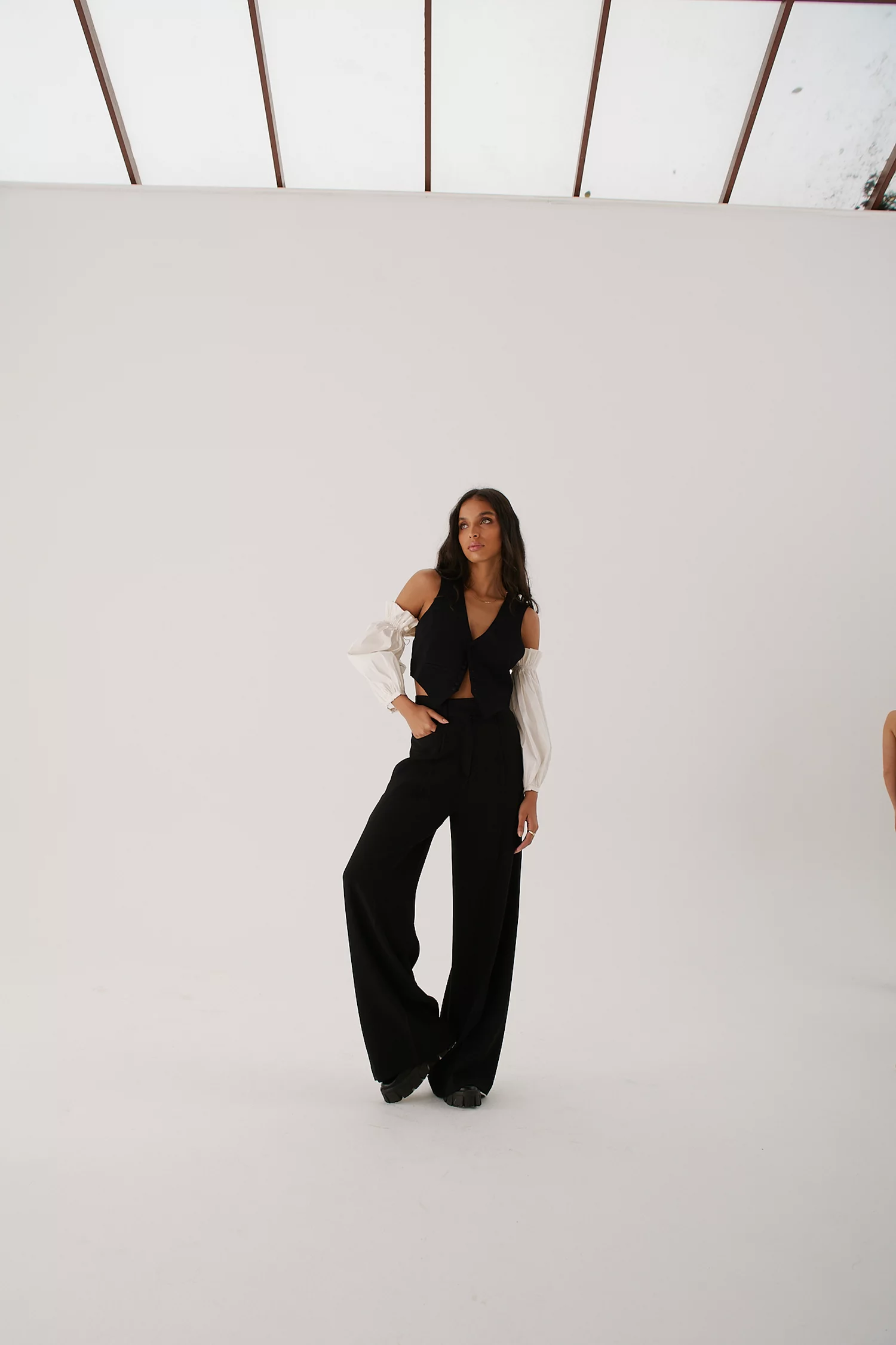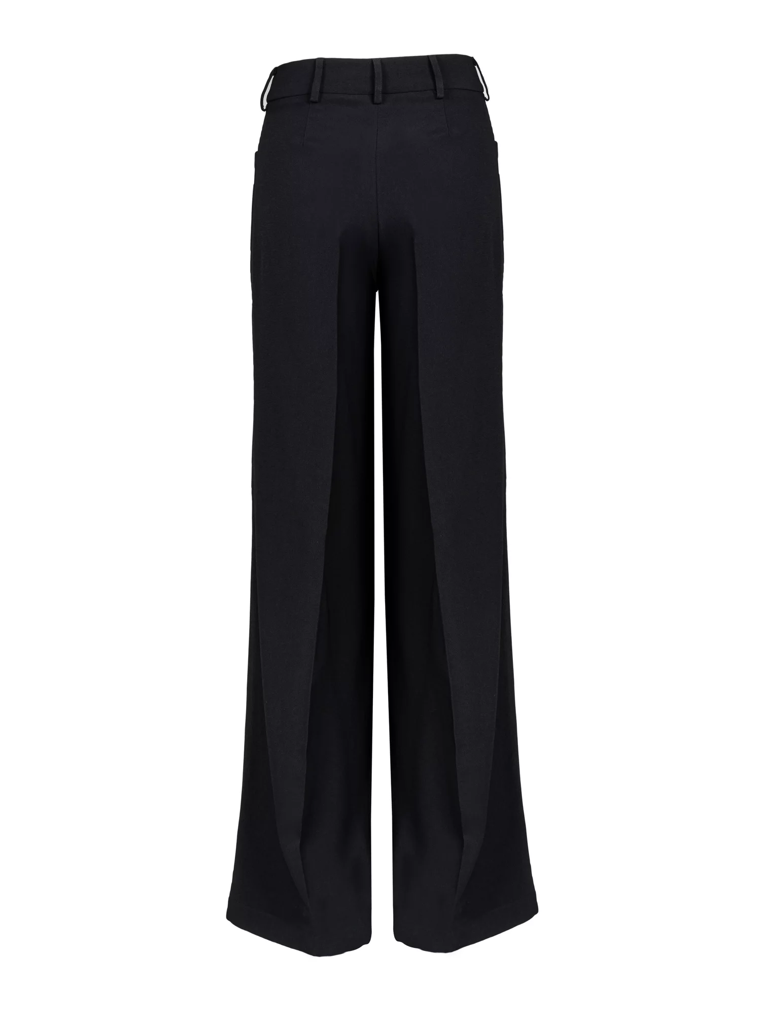 Pantalona em alfaiataria com cintura alta marcada, bolsos e fechamento com botão interno e colchete.
