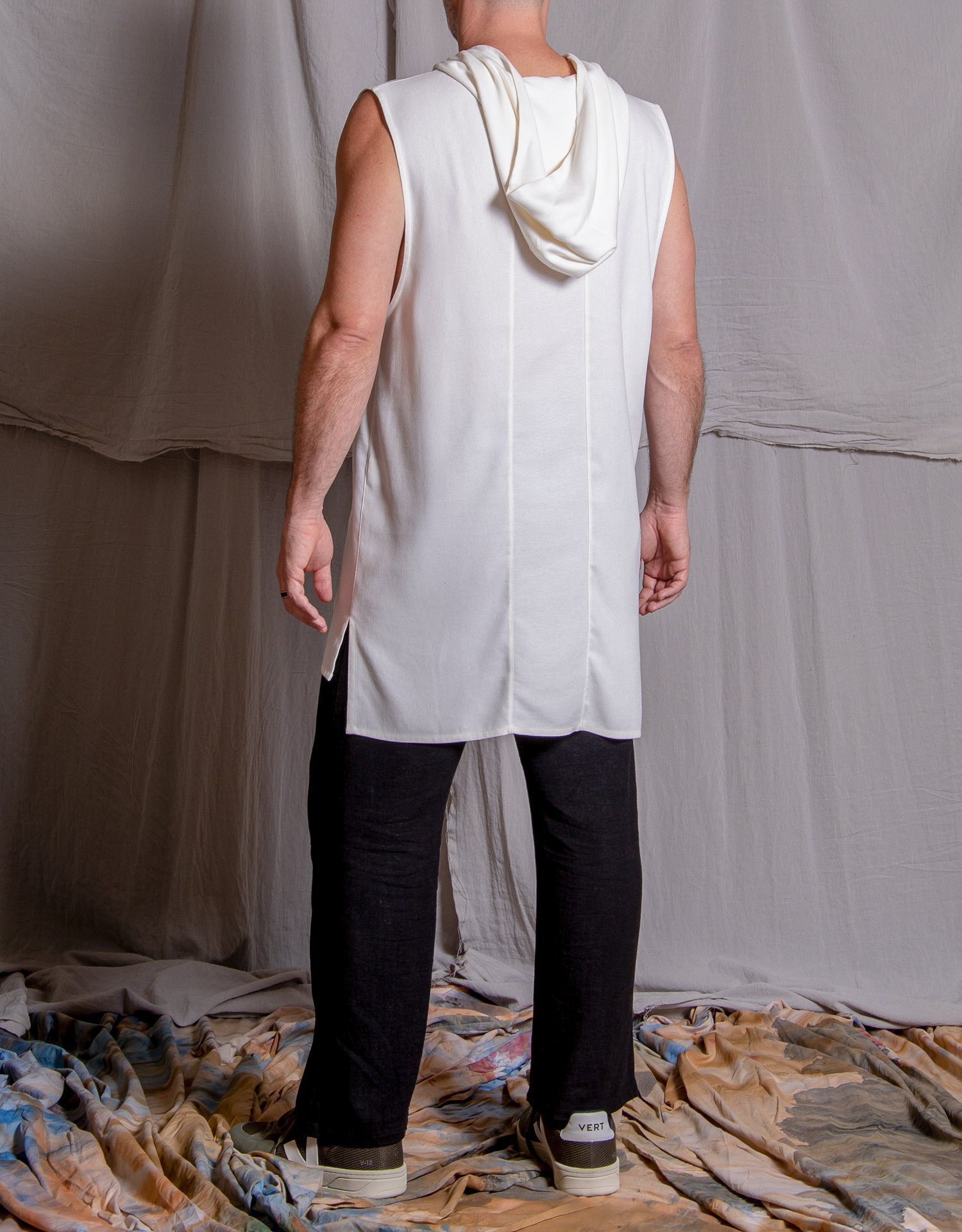 Peça confeccionada crepe branco de viscose. Possui capuz, bolso canguru frontal e fendas laterais. Sem fechamento.