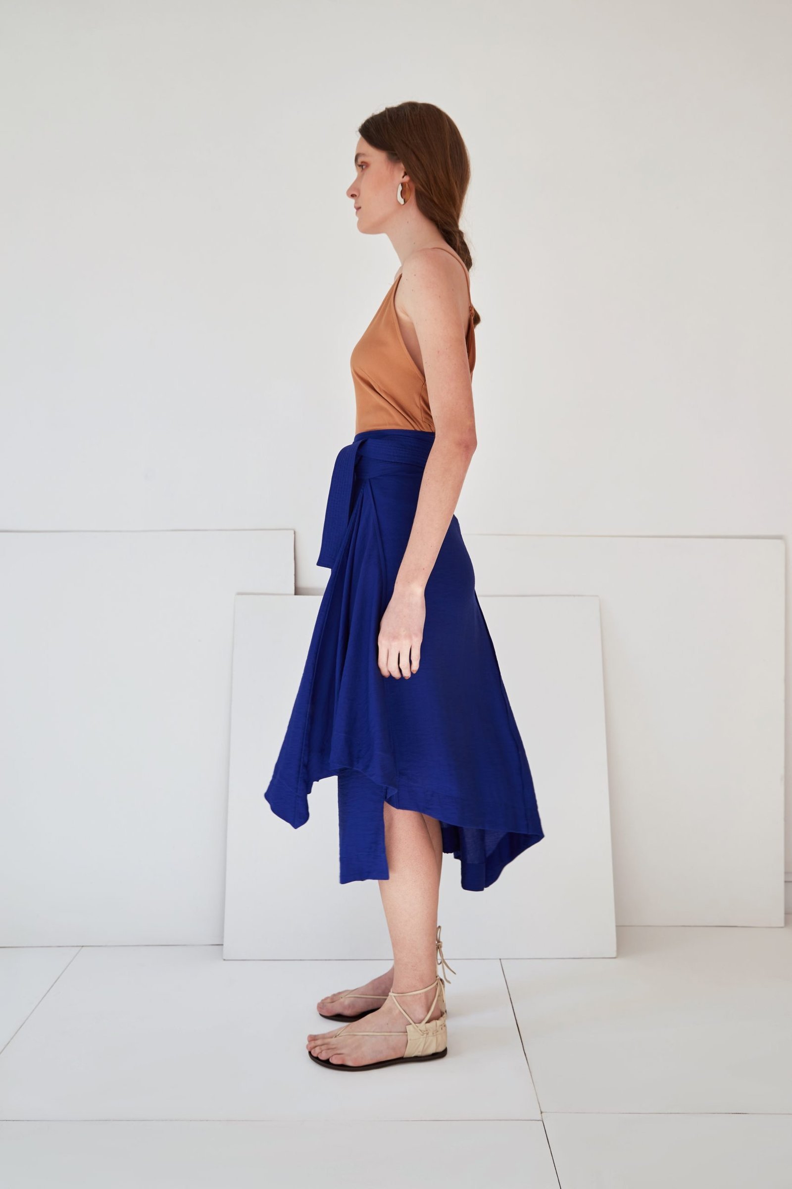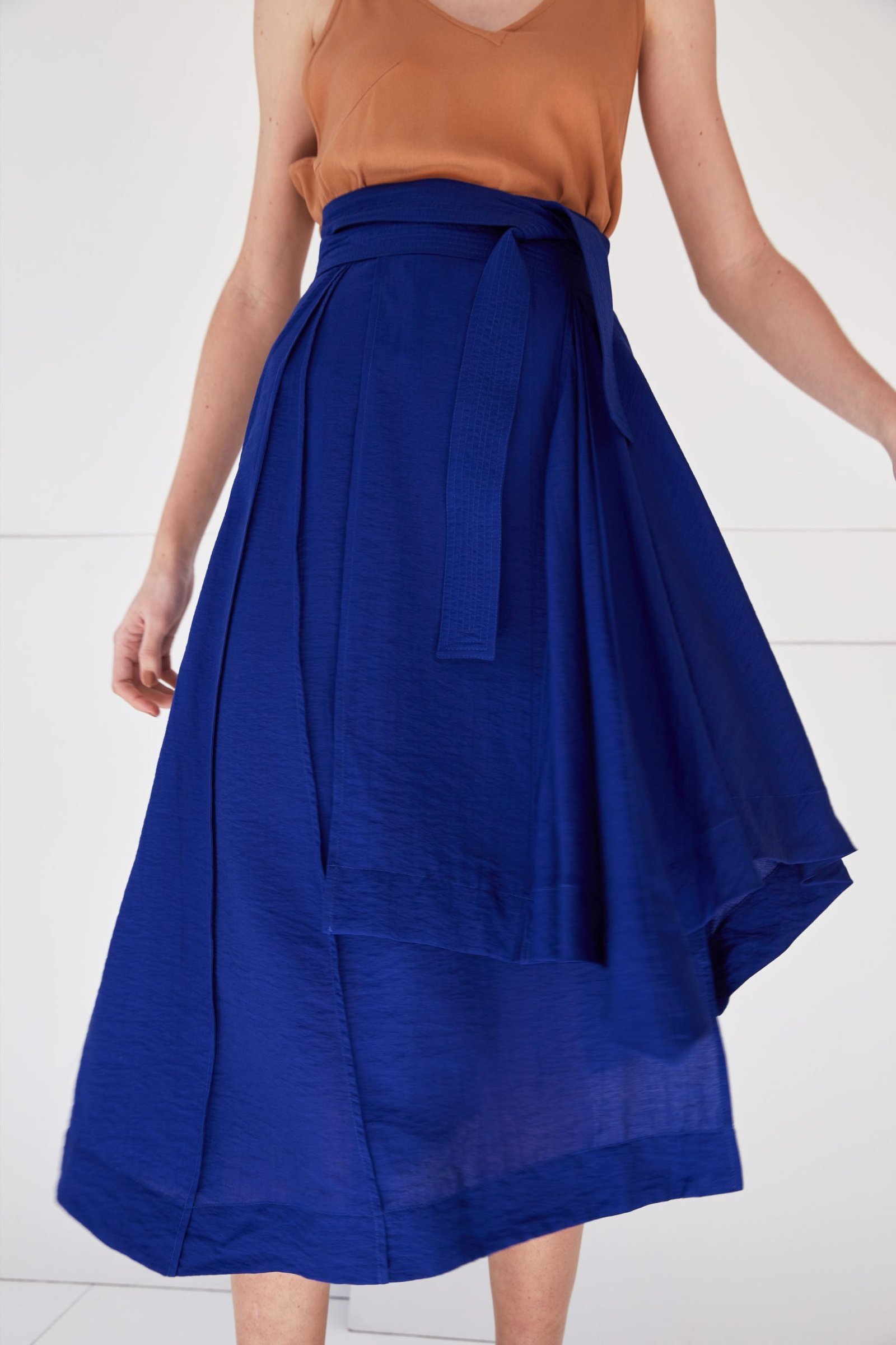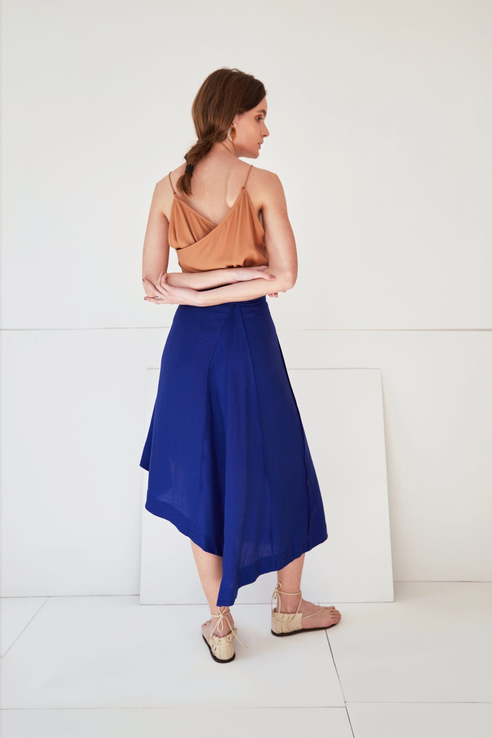 A saia LANA tem a modelagem composta apenas de formas geométricas, fazendo com que seu shape se transforme a cada movimento. A leveza e fluidez do caimento é ressaltada pelos acabamentos em costura francesa, que definem suas linhas únicas. A faixa pespontada e a barra assimétrica acrescentam um detalhe contemporâneo à peça.