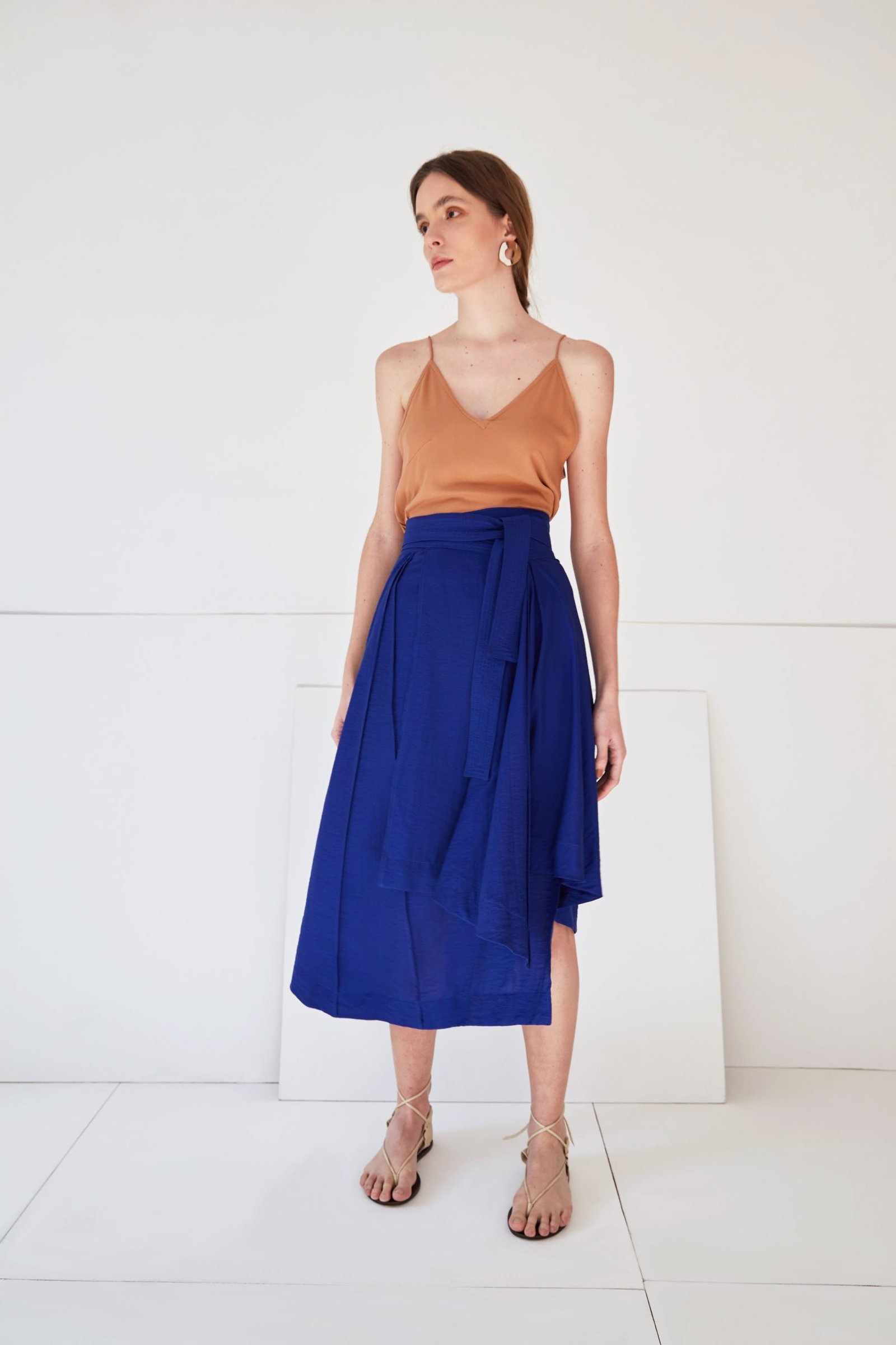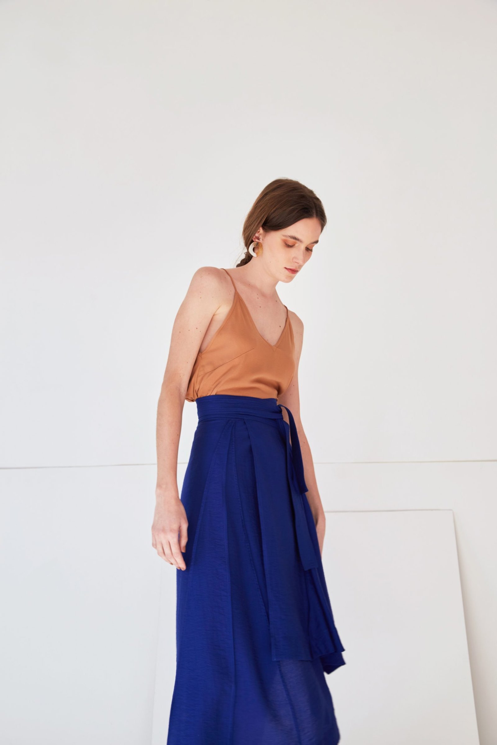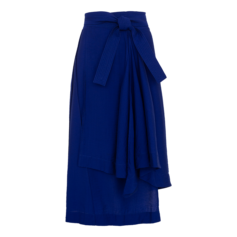 A saia LANA tem a modelagem composta apenas de formas geométricas, fazendo com que seu shape se transforme a cada movimento. A leveza e fluidez do caimento é ressaltada pelos acabamentos em costura francesa, que definem suas linhas únicas. A faixa pespontada e a barra assimétrica acrescentam um detalhe contemporâneo à peça.