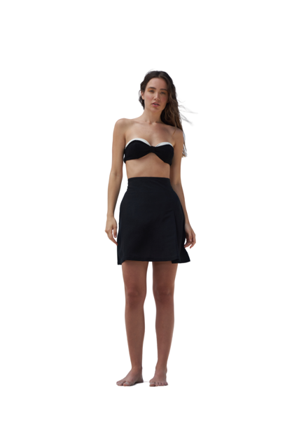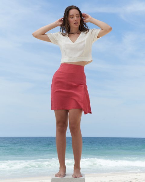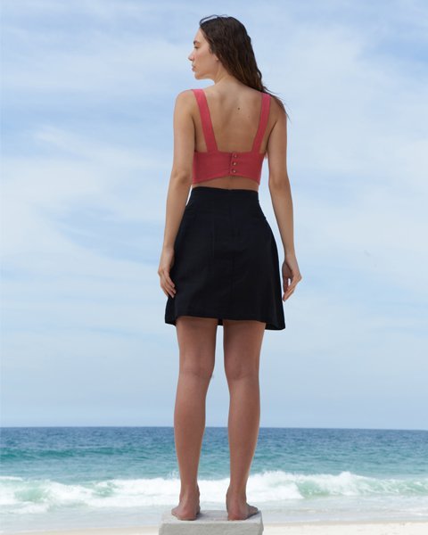 A Saia Tita une detalhes geométricos com acabamentos arredondados em uma peça a qual possui uma estética cool e jovial. Com comprimento curto a médio a fenda frontal em forma de prega/dobradura triangular confere movimento ao caminhar. Fechamento por zíper invisível nas costas.