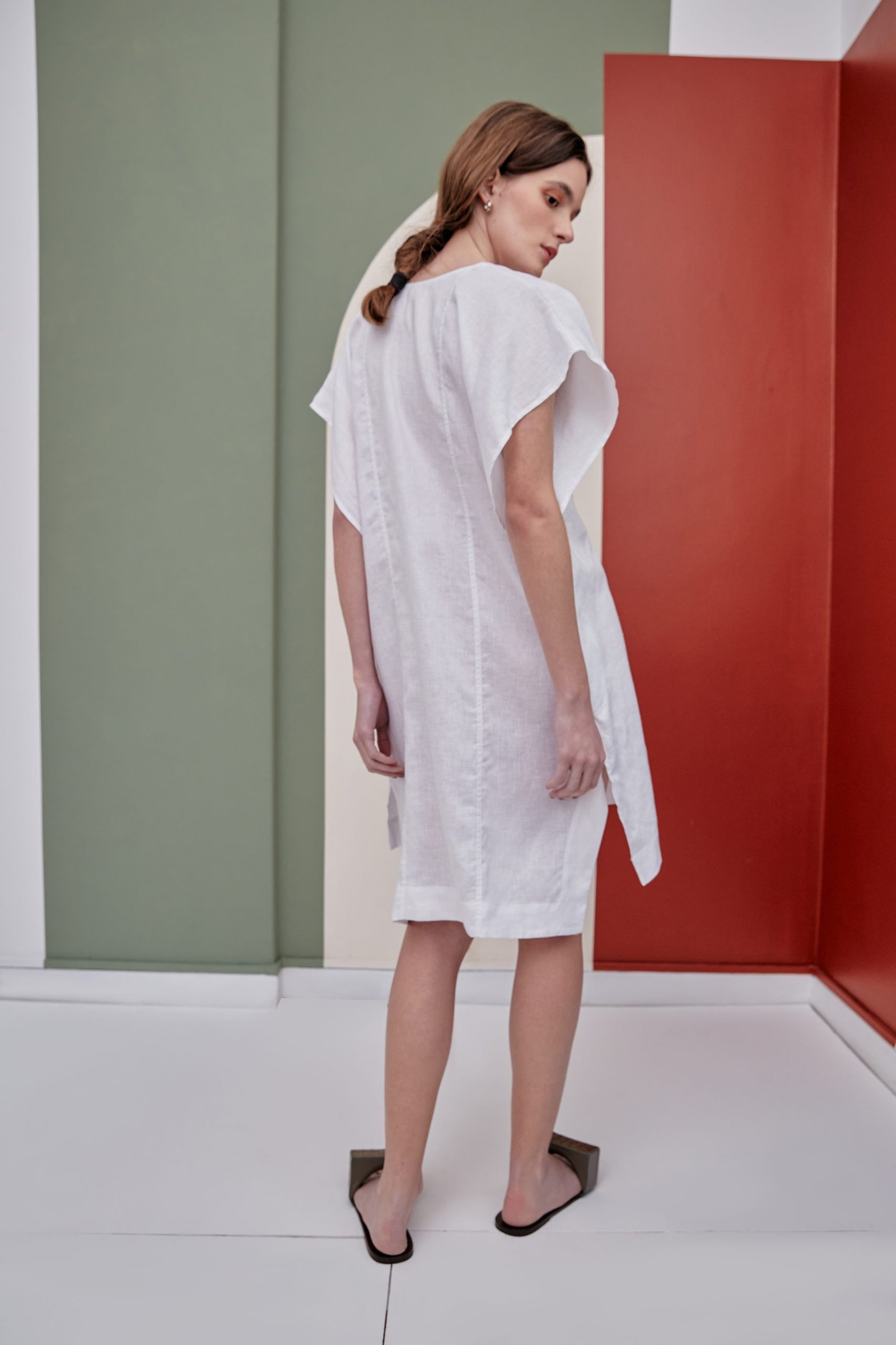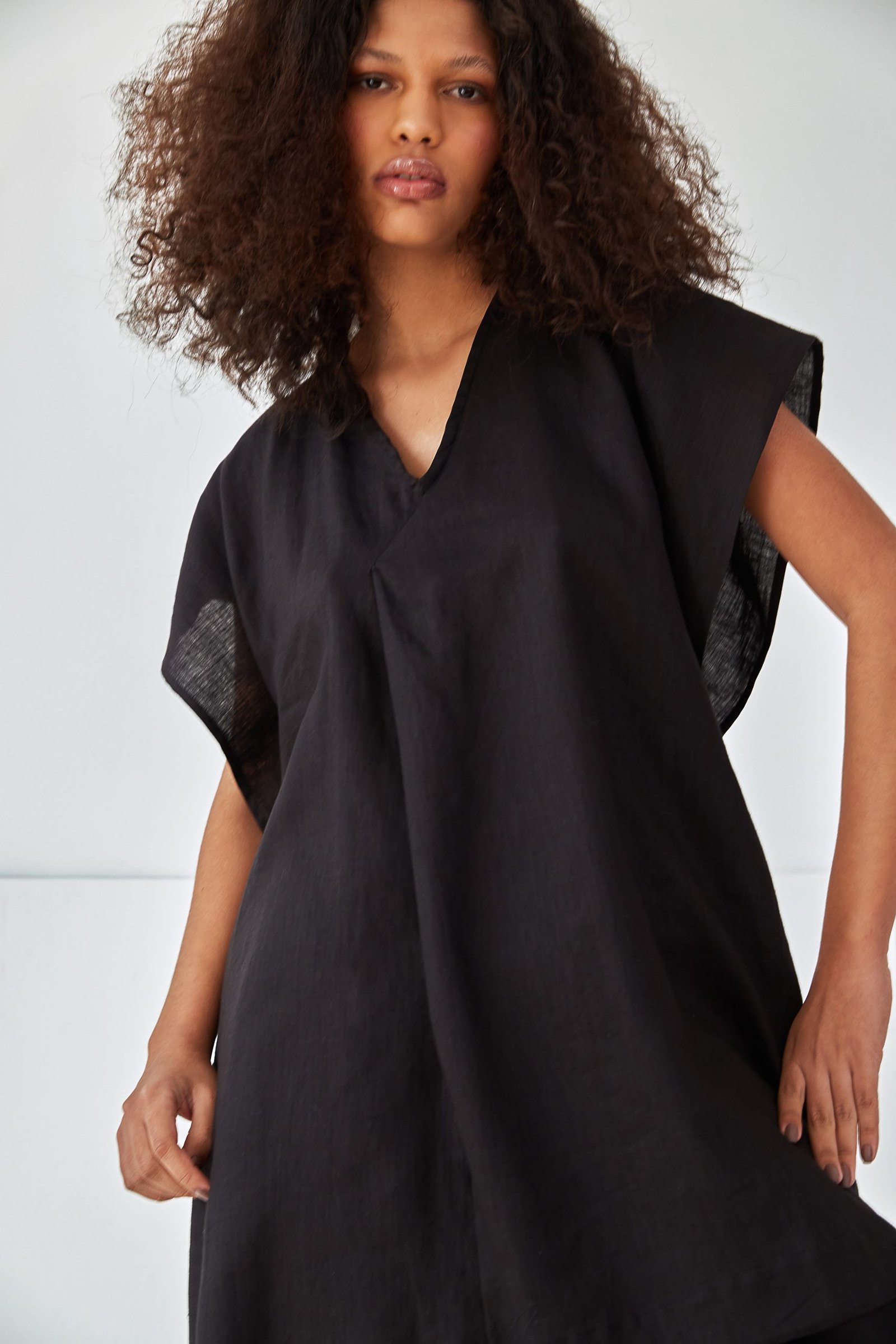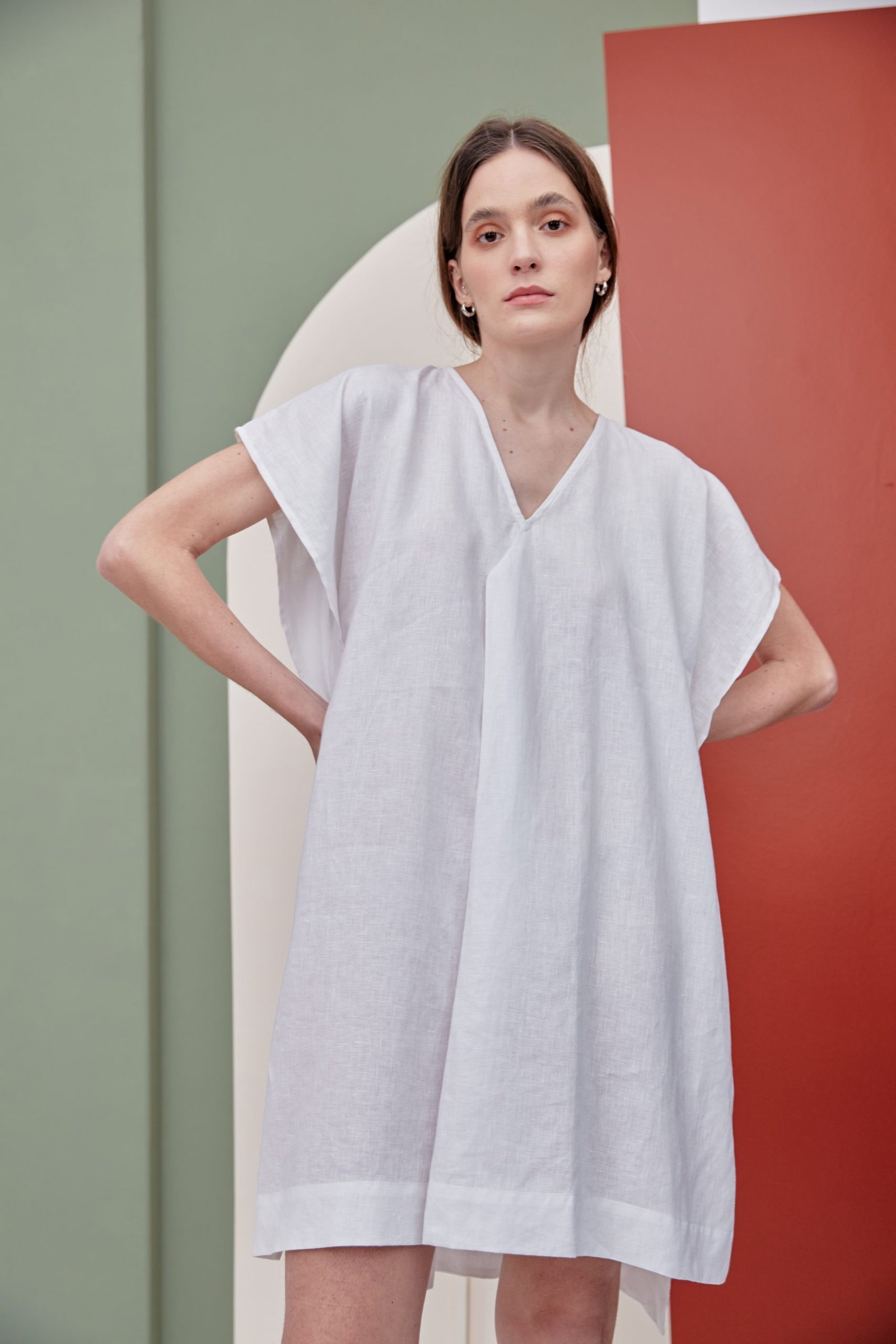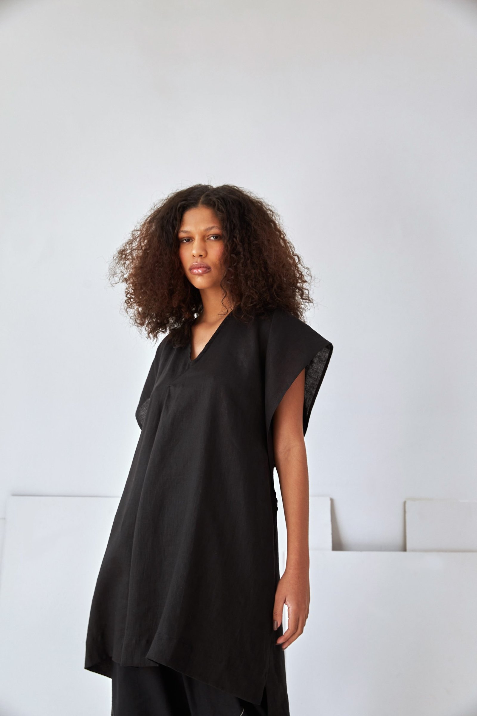 O vestido MARTHA é o nosso vestido túnica, em comprimento midi. Sua modelagem ampla foi construída como uma dobradura, dando destaque para as mangas e laterais sobrepostas. O tecido em 100% linho traz um caimento fluido, ideal para os dias que pedem mais leveza. Possui decote V e prega frontal.