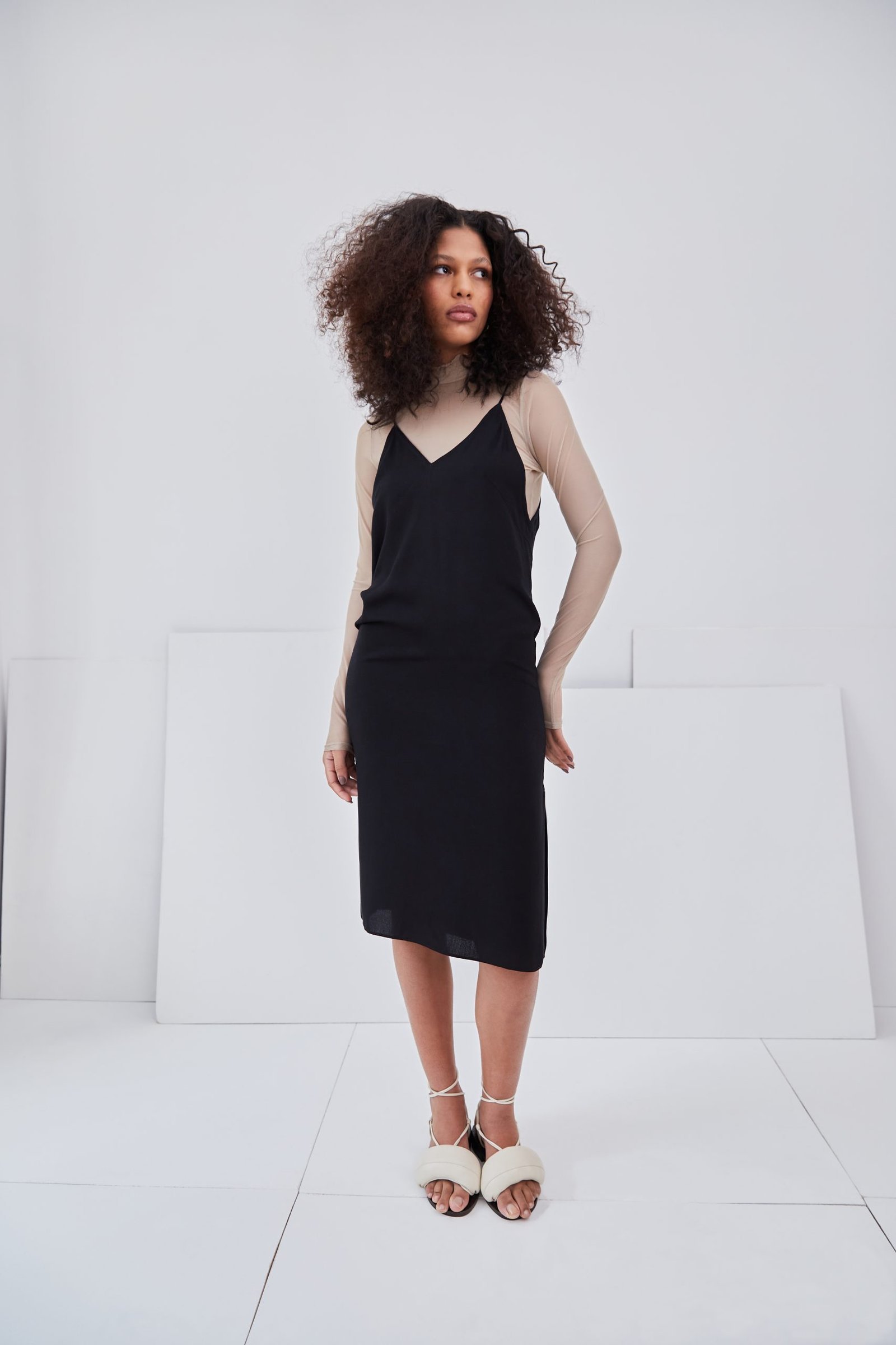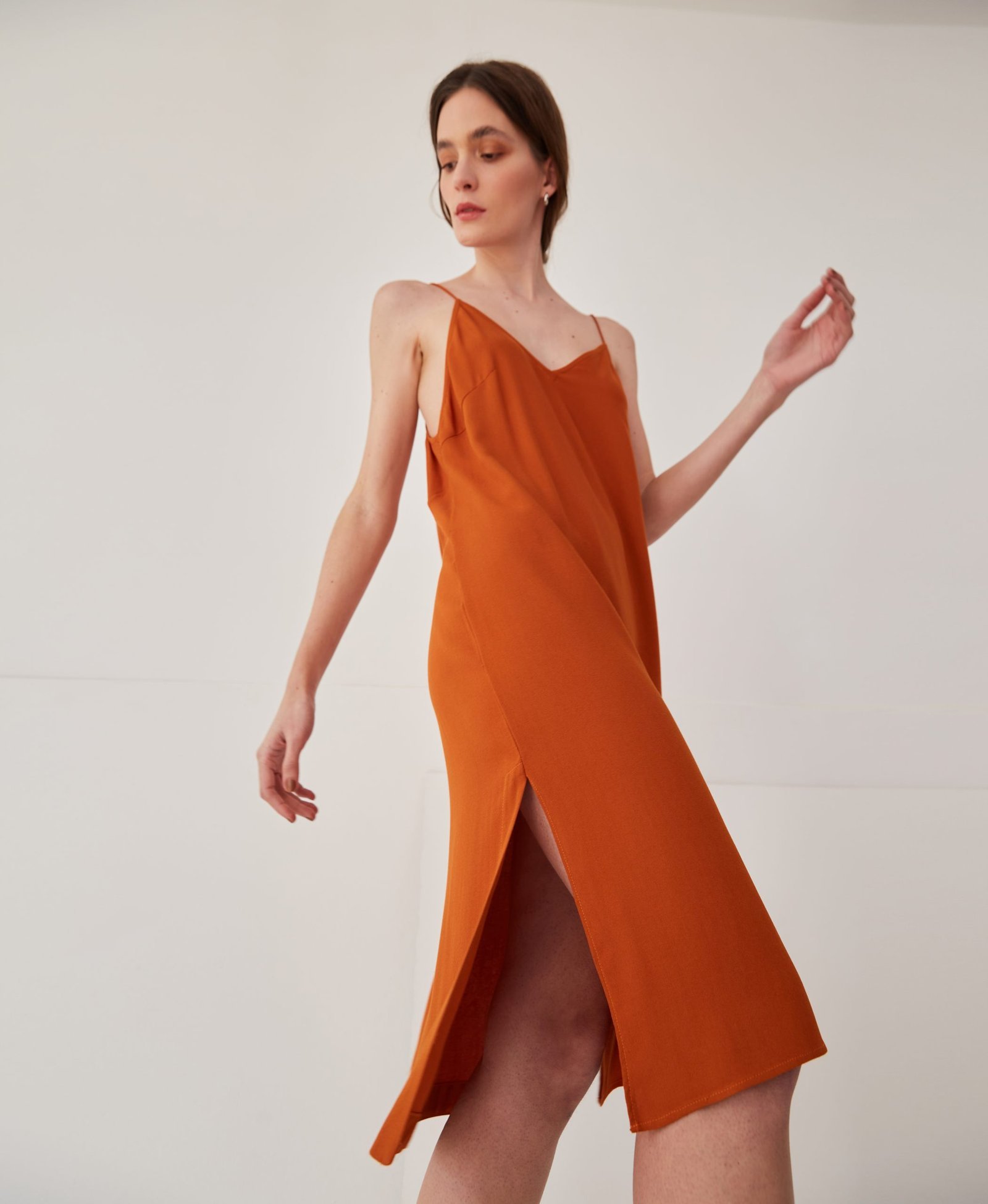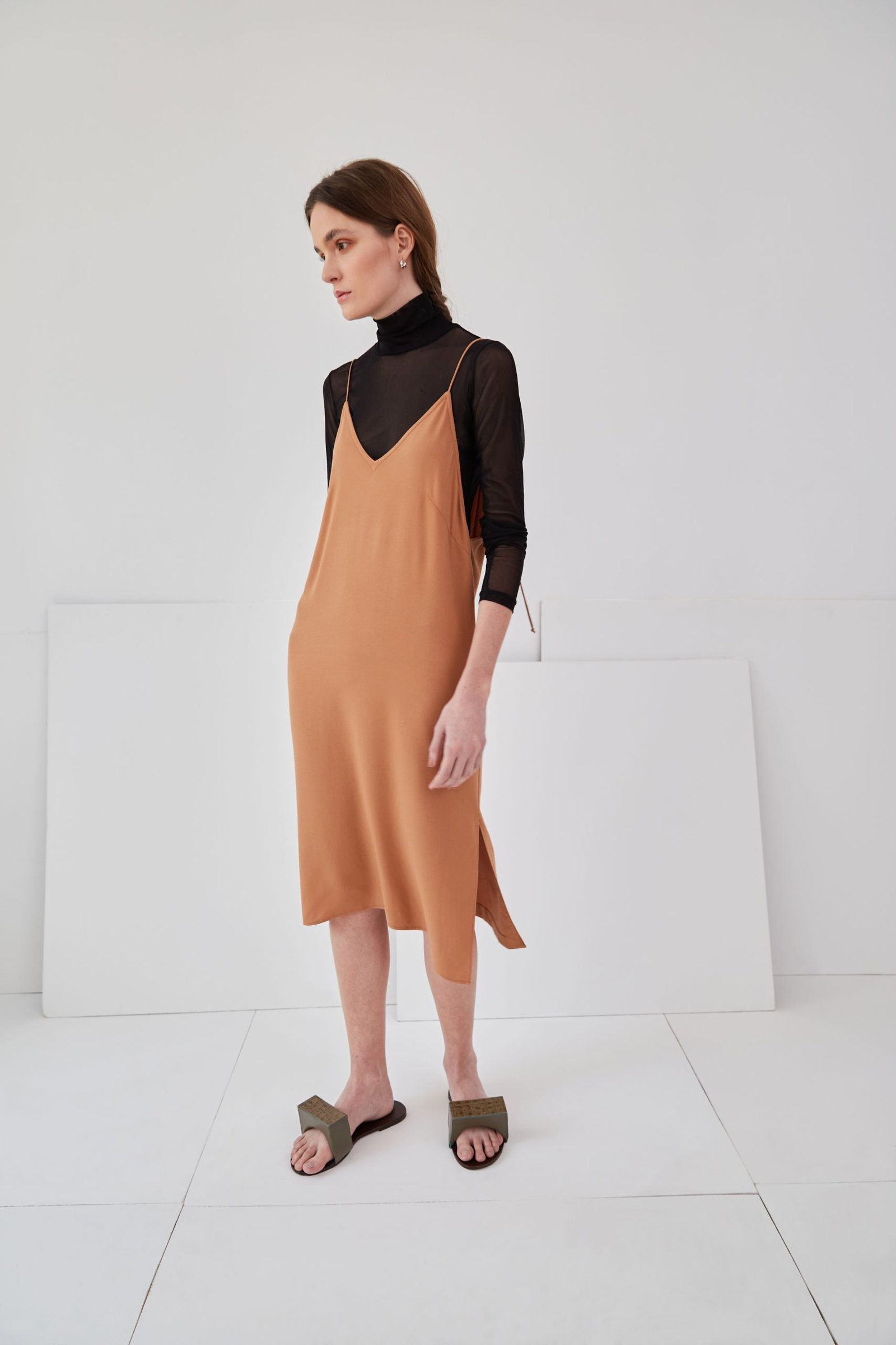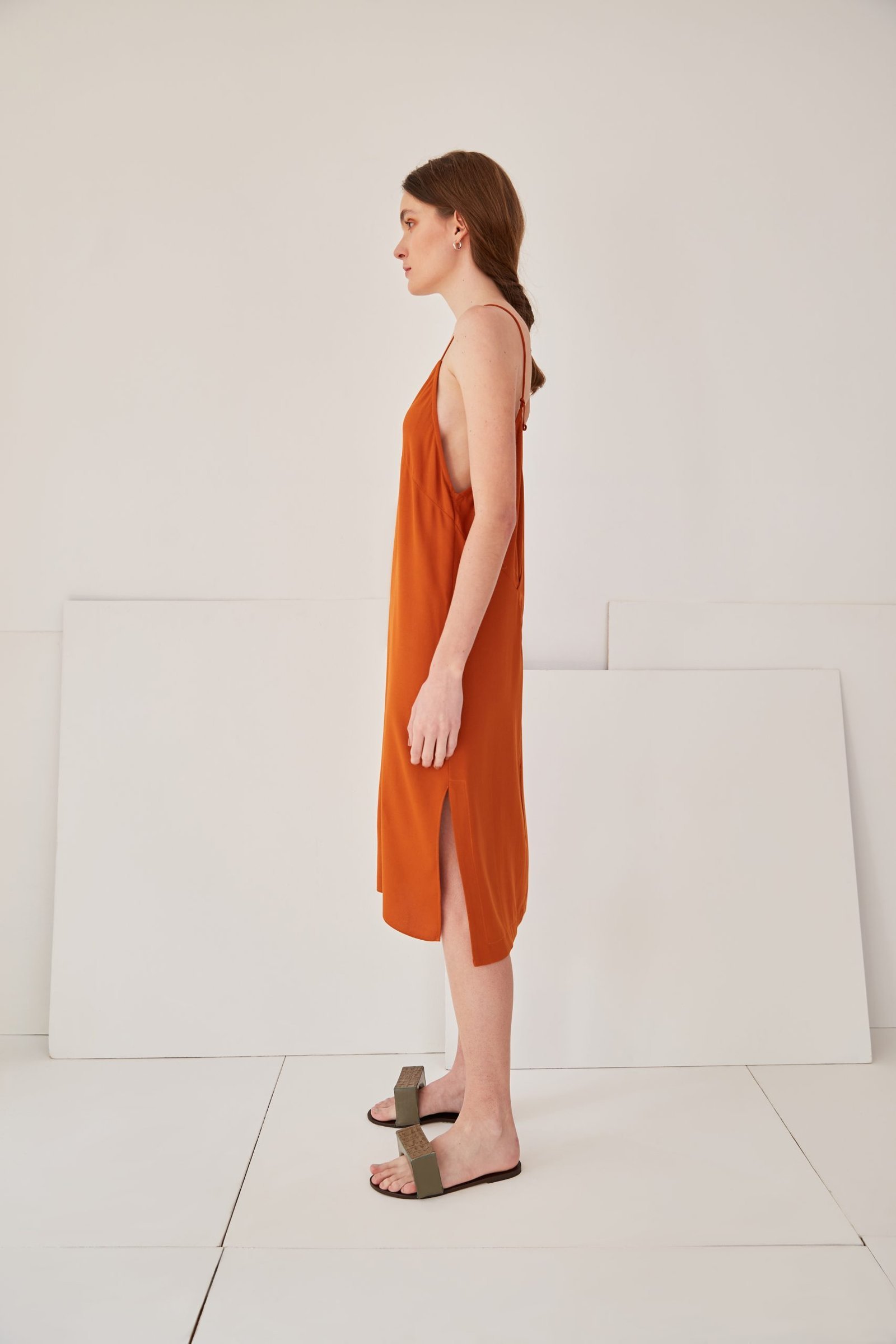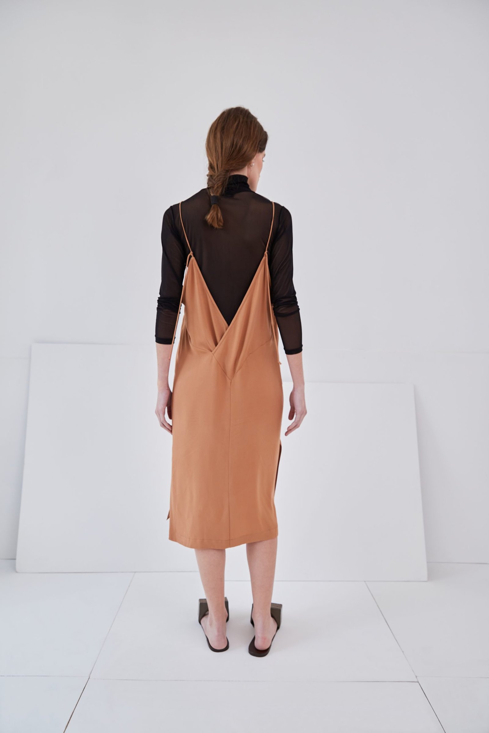 Vestido tipo slip, de comprimento midi, pode ser usado como uma peça única e como combinação, compondo com nossas peças.
