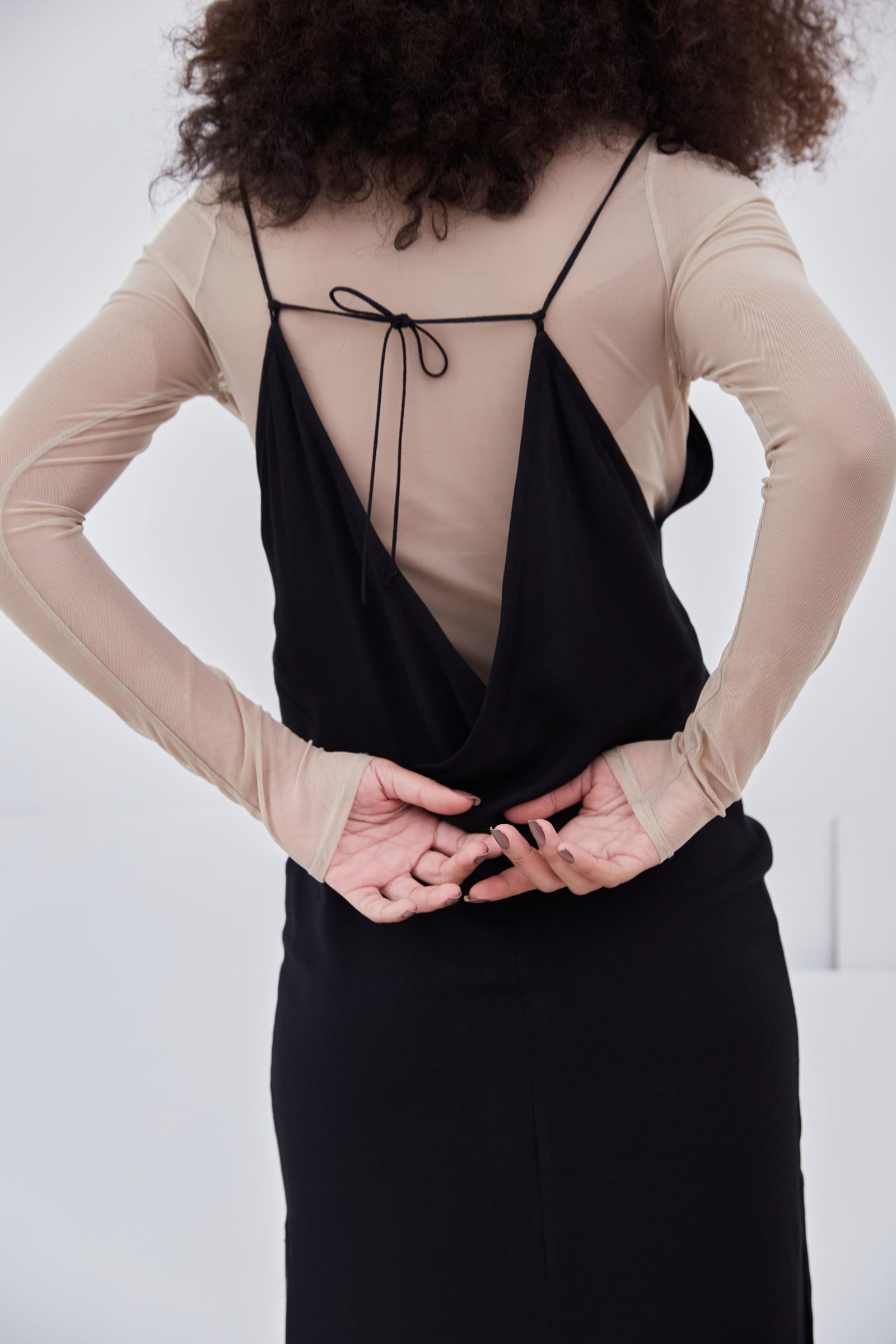 Com caimento leve e fendas laterais, possui decote em V, alças finas que podem ser ajustadas por amarração e costas em decote profundo, com acabamento em recortes sobrepostos.