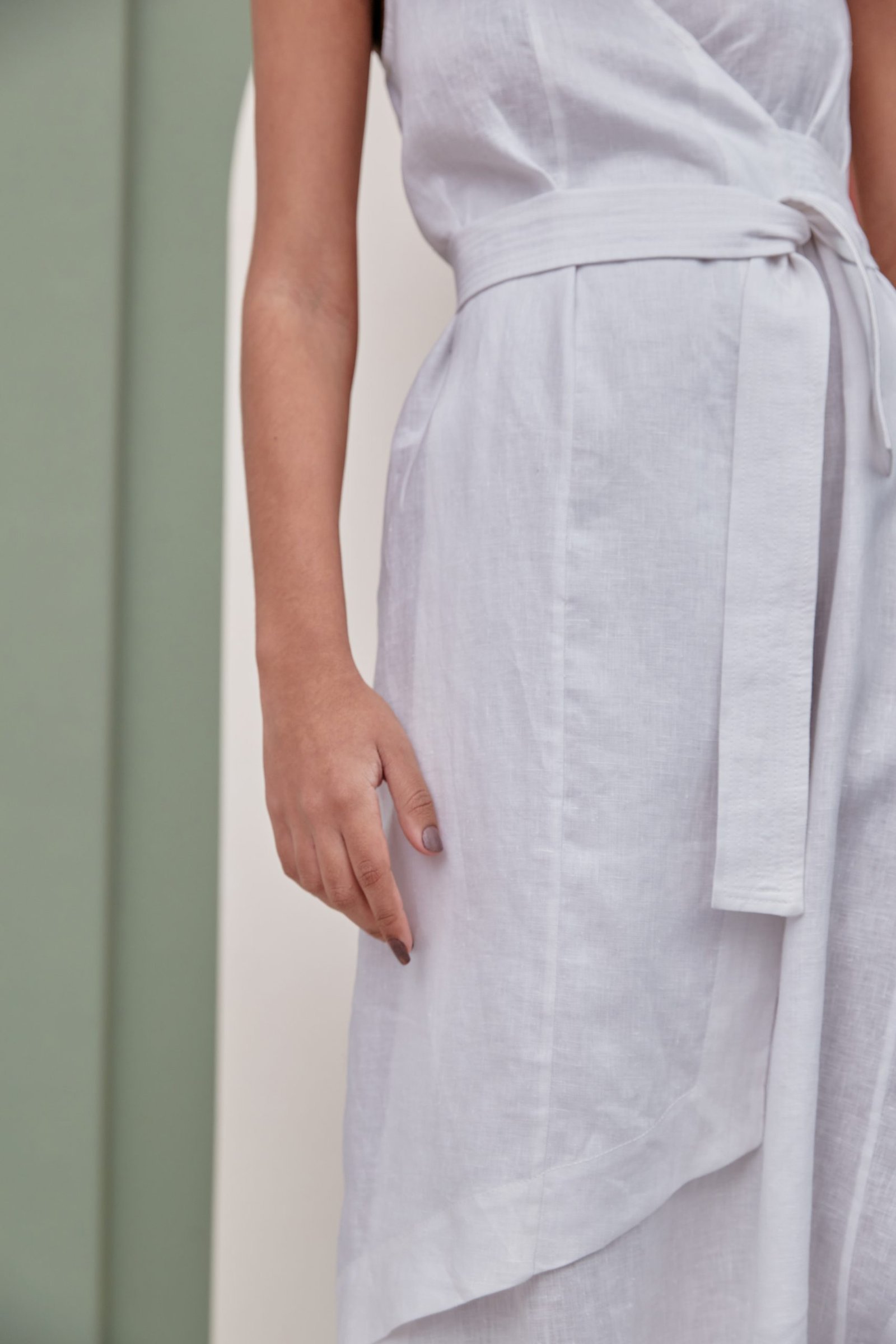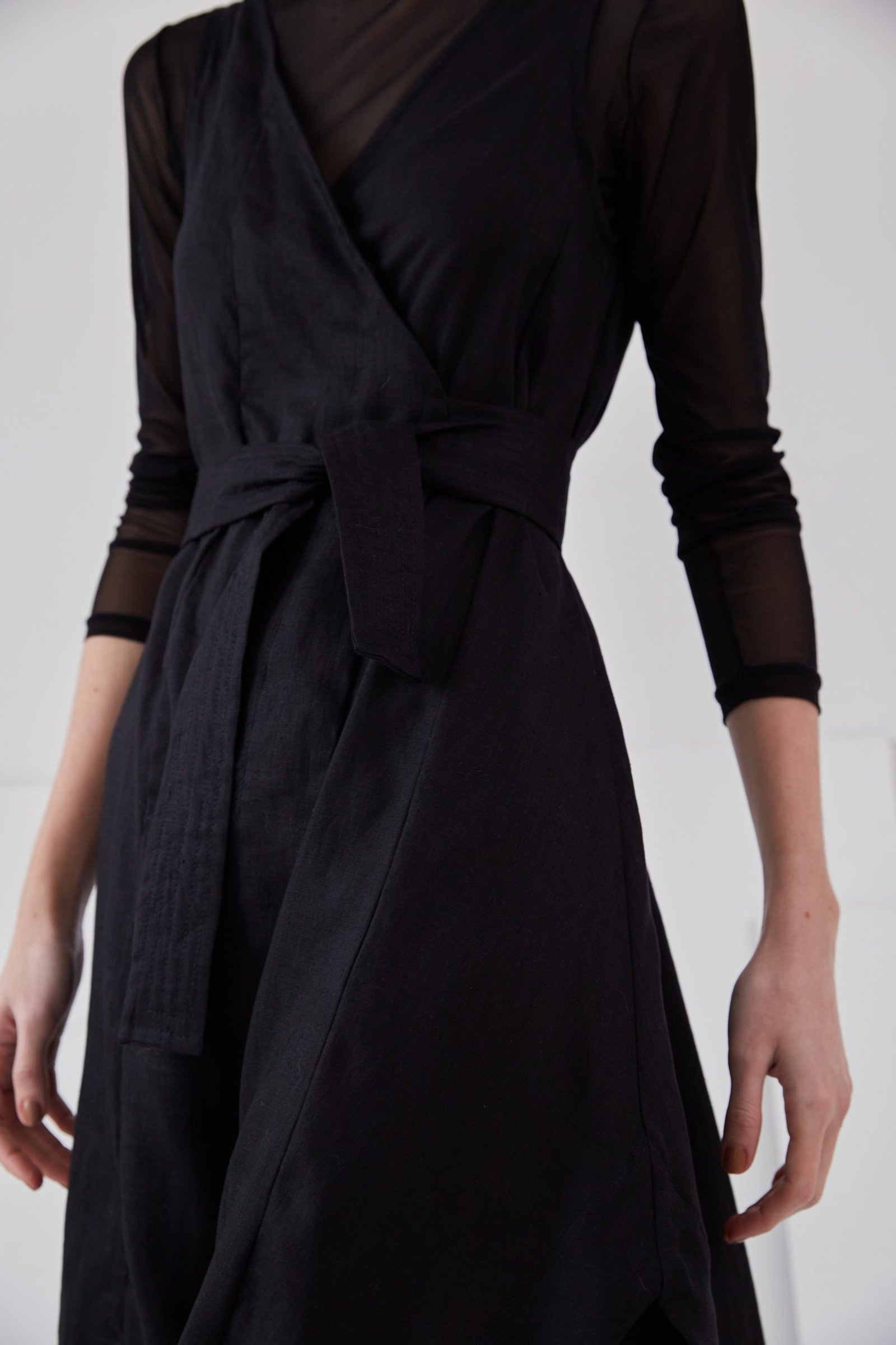Seu transpasse e recortes assimétricos possibilitam silhuetas variadas, e os detalhes de barrado – que emolduram a peça – tornam todos os seus movimentos intrigantes. Já as faixas de amarração trazem uma nova camada de textura, com seus desenhos pespontados.