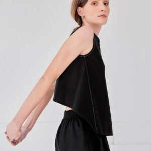 Top de modelagem assimétrica com decote canoa, sua frente é mais alongada do que as costas – que tem recortes assimétricos sobrepostos – possibilitando seu uso também ao contrário, como um colete.