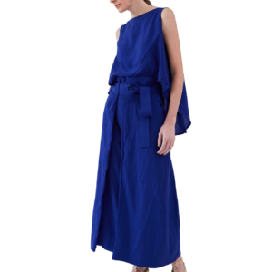 Top assimétrico de caimento amplo e fluido, possui recortes frontais com forro embutido e pregas nas costas. Disponível na cor azul índigo.